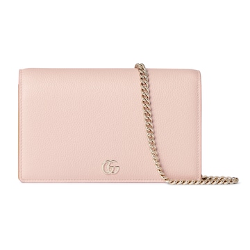 GG Marmont系列匠心呈现双色款式。这款链带钱包以粉色和黄色牛皮革打造,匠心缀饰双G细节。