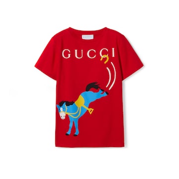 品牌童装系列以经典材质、精湛工艺与清新色调焕新诠释标志性图案。这款儿童T恤甄选针织棉打造,精心缀饰Gucci马匹印花。