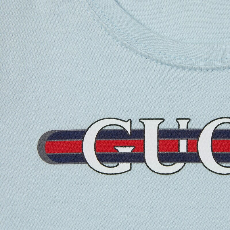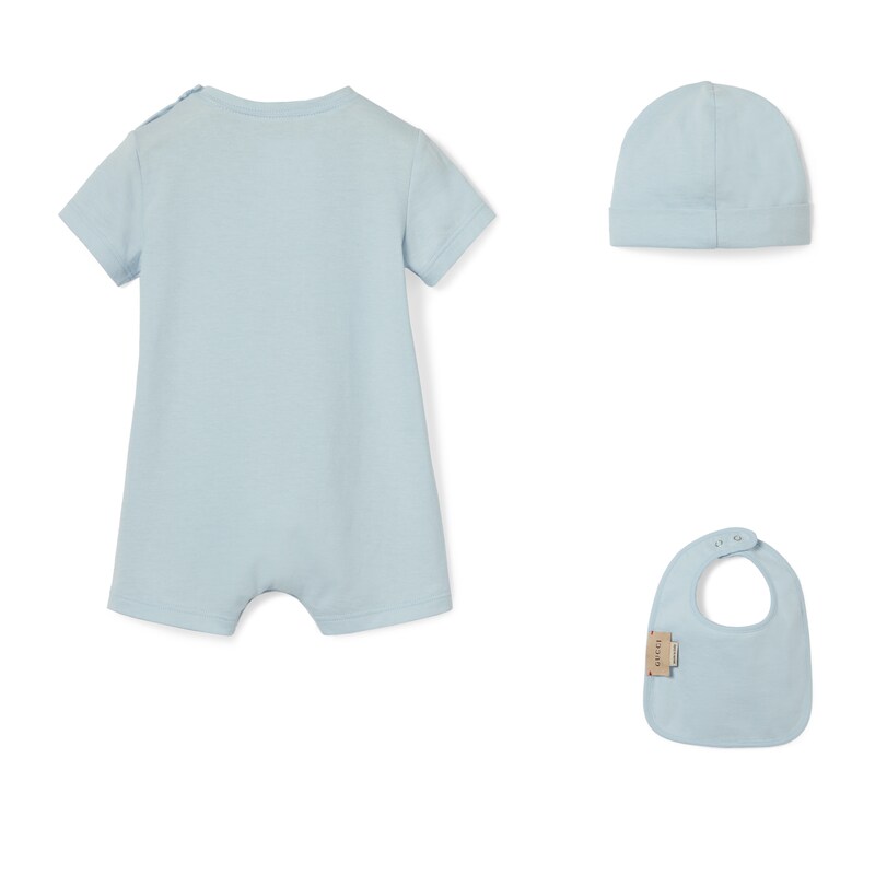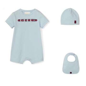 2025早春儿童系列单品以多变风格焕新演绎典藏条纹织带。成衣、鞋履和配饰匠心融蕴红蓝滚边,为整个设计注入一抹运动风尚。这款婴儿三件套礼品套装包括一件缀饰Gucci织带印花的针织棉连体衣。帽子和围兜缀饰红蓝织带提环细节,令整个设计愈发亮眼。