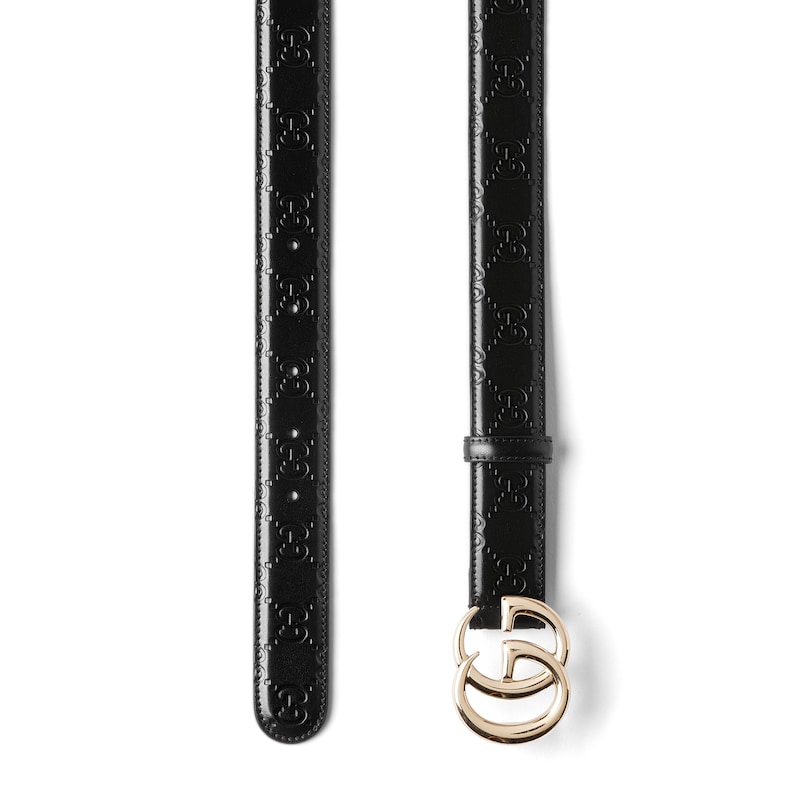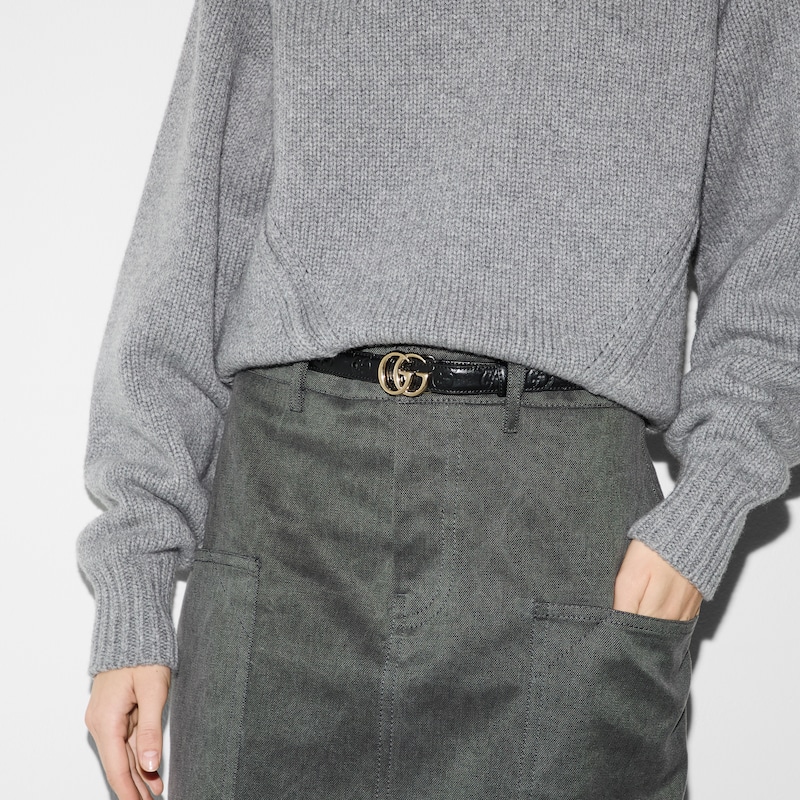 标志性GG图案继续为牛皮革配饰增色添彩,以现代风范演绎昔日经典。这款窄版腰带以黑色GG牛皮革制作,巧妙点缀浅金色调双G搭扣。