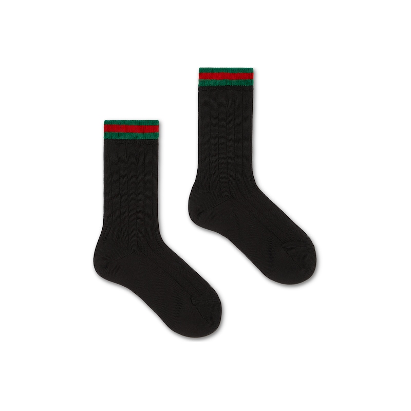 2025早春儿童系列单品以多变风格焕新演绎典藏条纹织带。成衣、鞋履和配饰缀饰绿色和红色滚边,演绎适合每次探险的运动风尚。这款儿童棉袜缀饰红绿条纹织带。