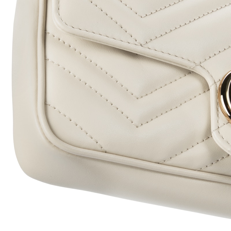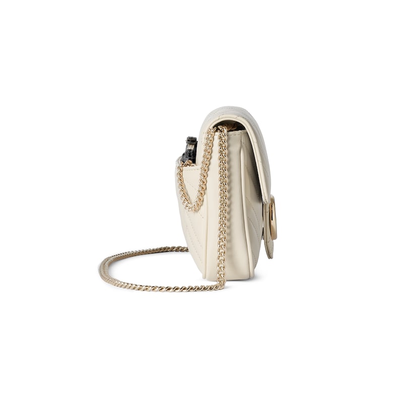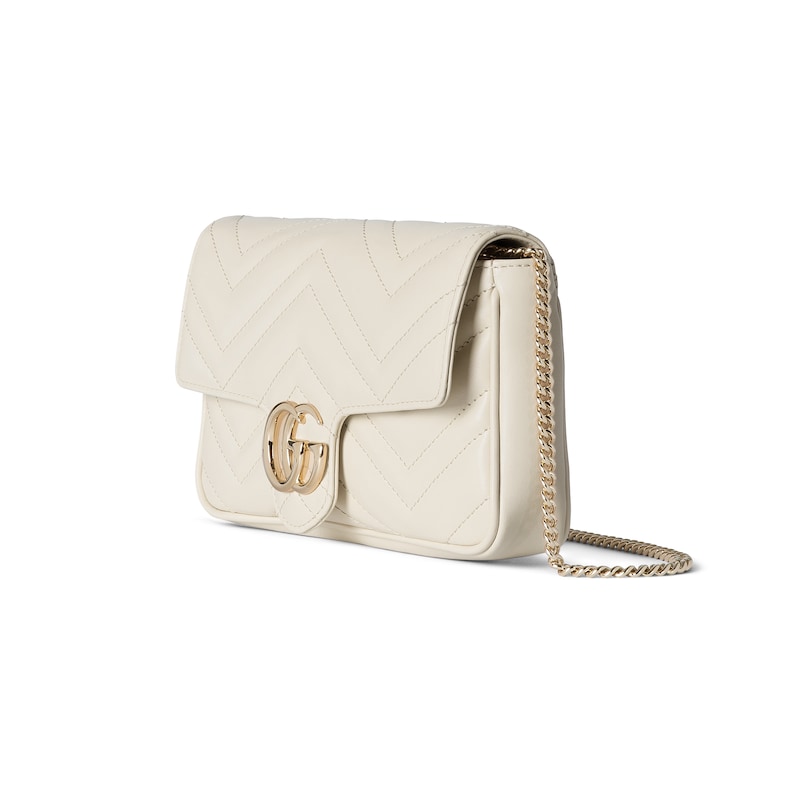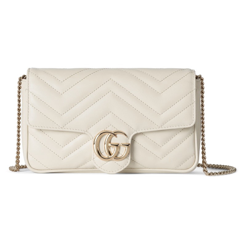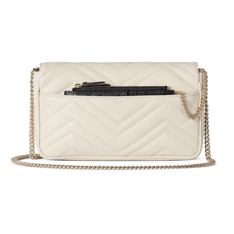 双G配件设计在品牌现代风格中注入传统精髓,为衣橱带来隽永单品。这款链式手袋以经典白色V型Matelassé皮革打造,内部设有一个可系挂的黑色撞色皮革卡片夹。