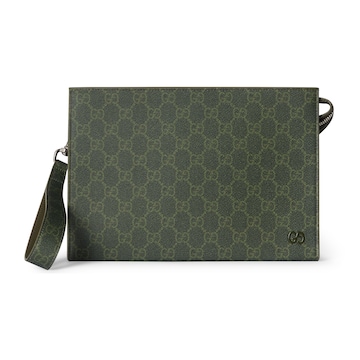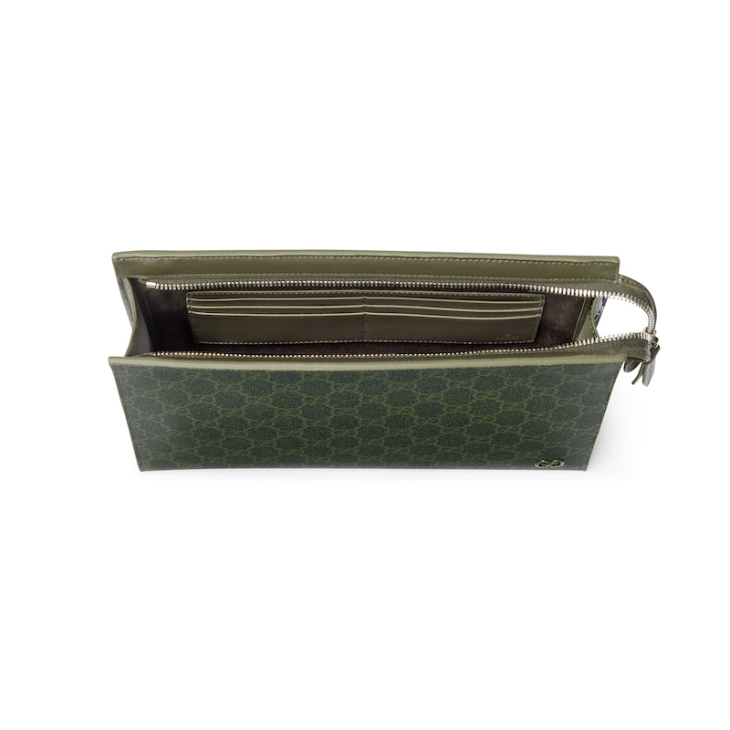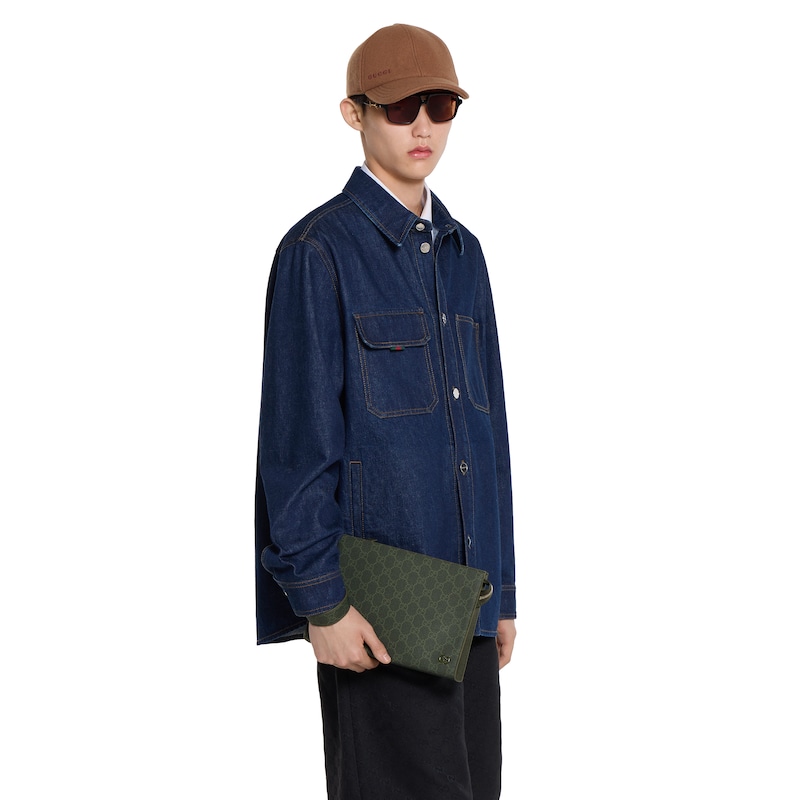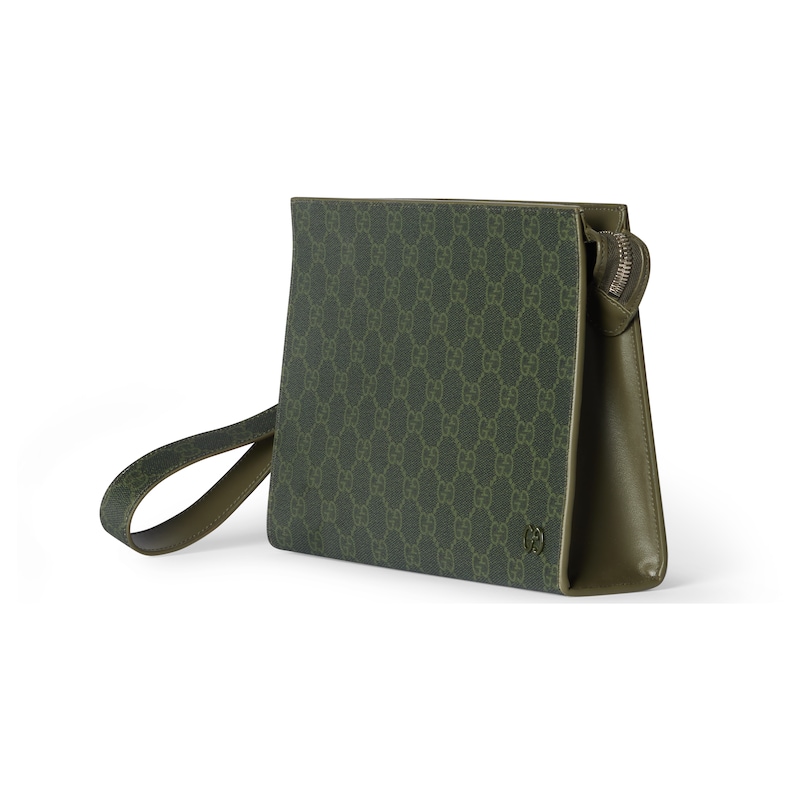 2025秋冬系列选用GG字母交织图案涂层织物焕新诠释品牌一大标志性图案。这款小号手拿包以新意织物匠心打造,搭配同色调皮革滚边和陶瓷效果GG细节,一展设计巧思。