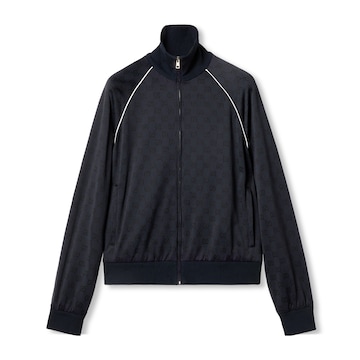 多款新季针织单品升级演绎Gucci品牌元素。这款拉链夹克采用GG尼龙棉质平纹针织提花面料匠心打造,精彩演绎品牌标志性字母交织图案。