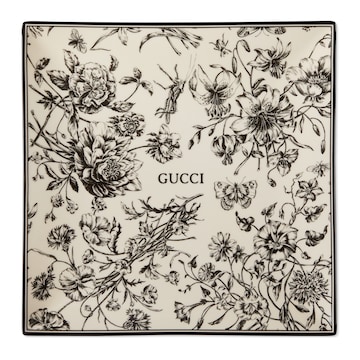 Gucci Décor家饰系列从品牌标志性符号元素中撷取灵感,巧妙融入缀饰Gucci花卉素描印花的瓷质首饰托盘以及多款瓷质单品之中。单色图案点缀多款单品,灵感源自大自然的印花仿若精致的手绘素描。