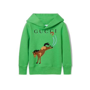品牌童装系列以经典材质、精湛工艺与清新色调焕新诠释标志性图案。这款儿童卫衣甄选毛毡针织棉打造,精心缀饰Gucci马匹印花。