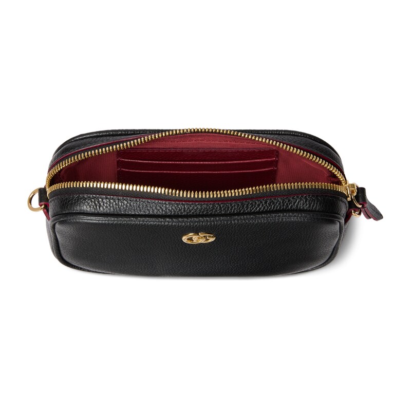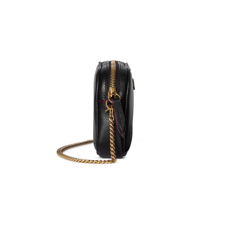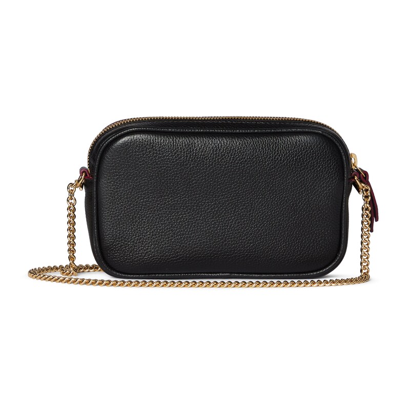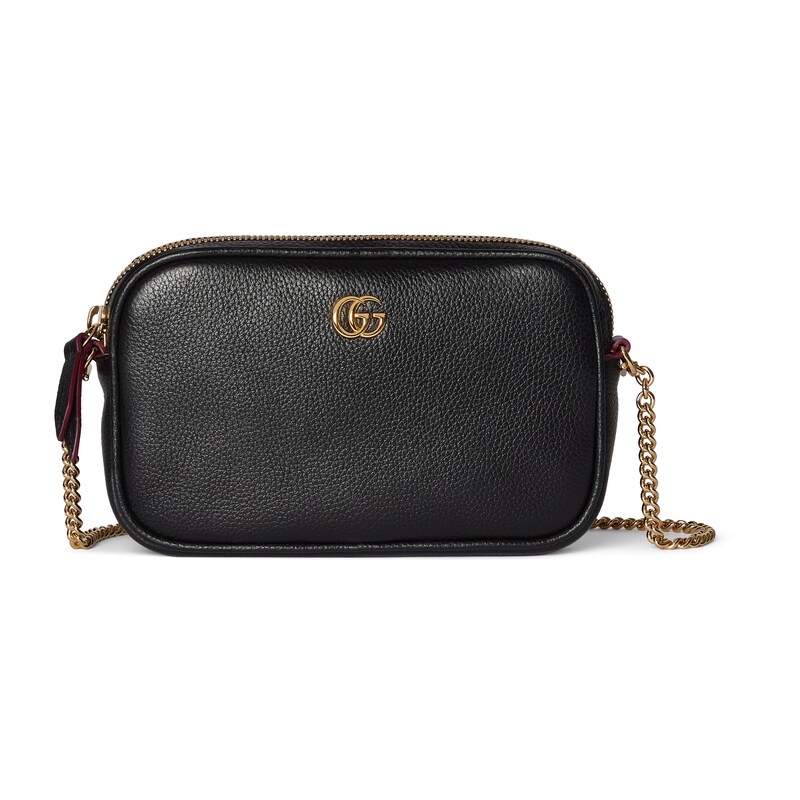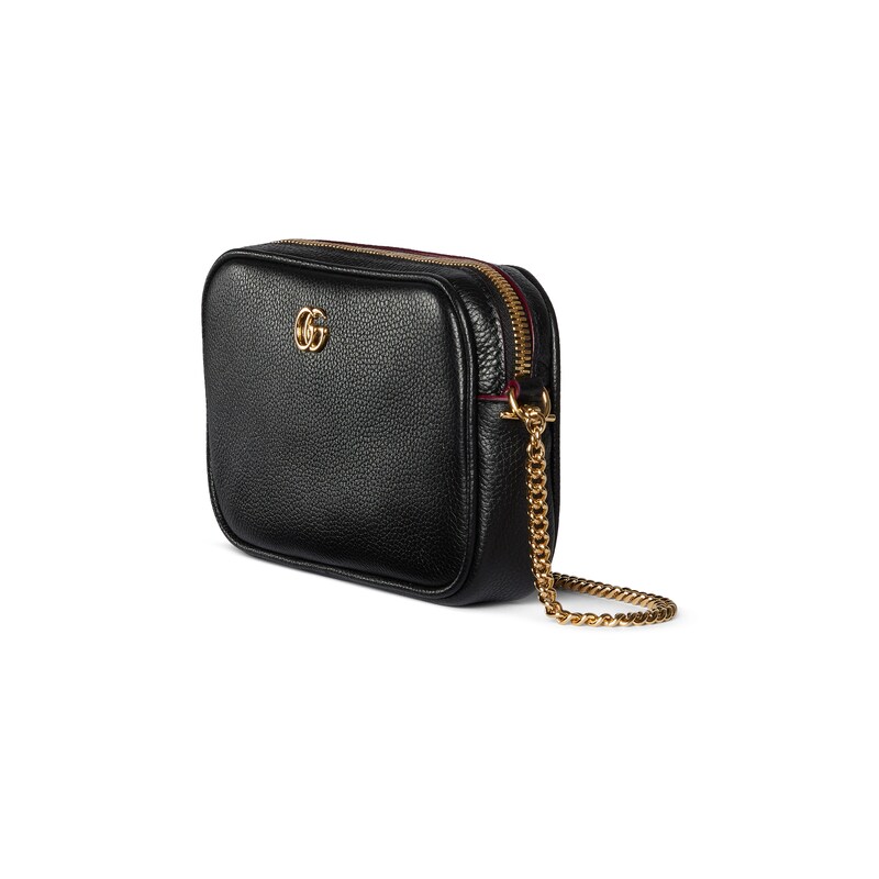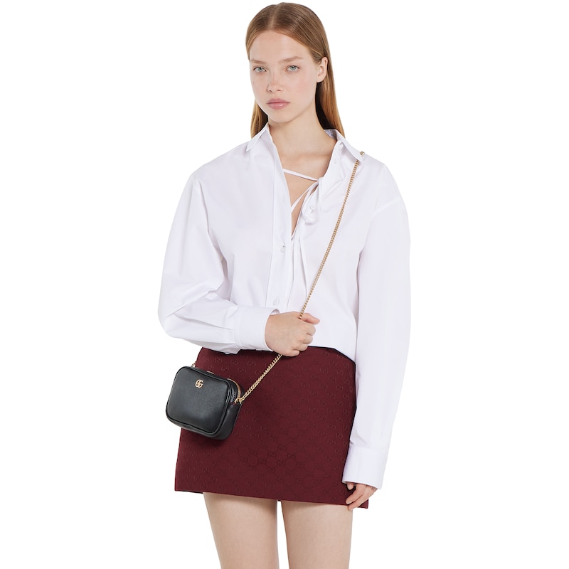 金色调双G造型配件不仅是GG Marmont系列的标志性元素,亦是对Gucci典藏图案的现代化演绎。这款拉链开合的牛皮革相机包配有链式包带,内部设有两个卡片隔层,可轻松收纳各类卡片。