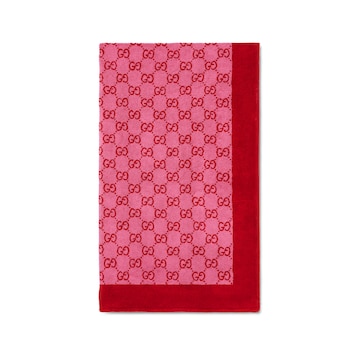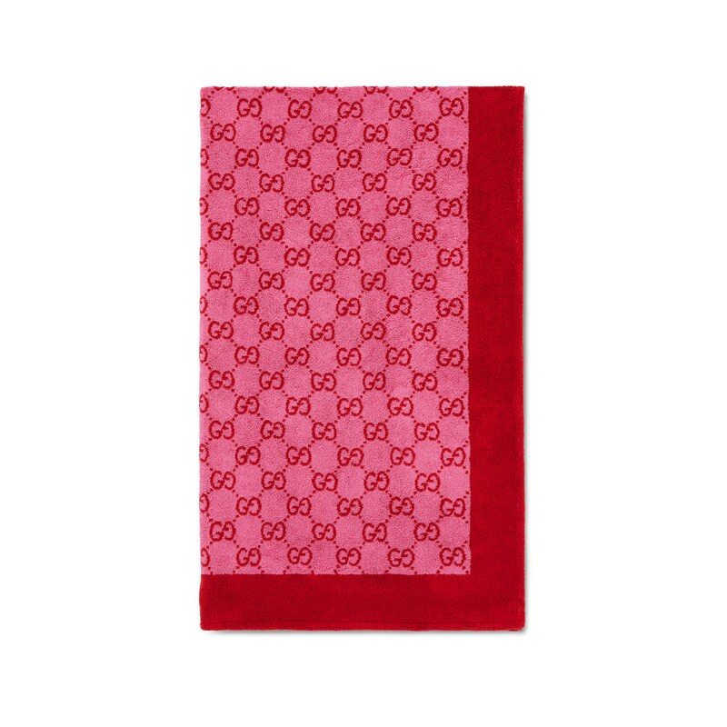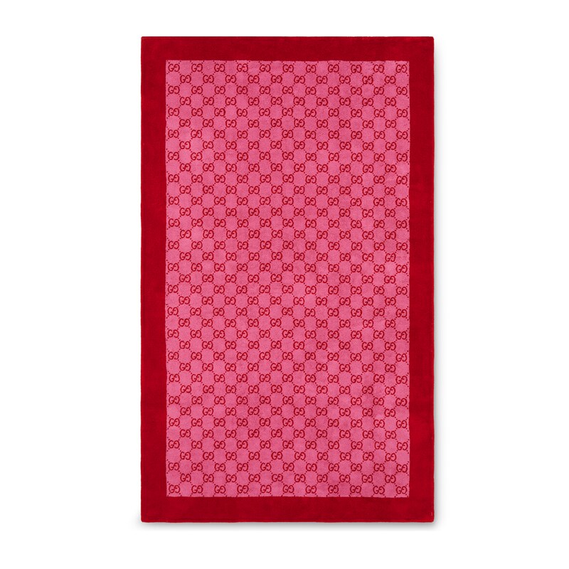 各式软配饰倾心颂扬典藏印花和俏皮配色,其中包括罩衫、渐变效果纺织品及自带收纳袋的可折叠双面帽子。这款沙滩毯以粉色GG厚绒布匠心打造,配以红色滚边。