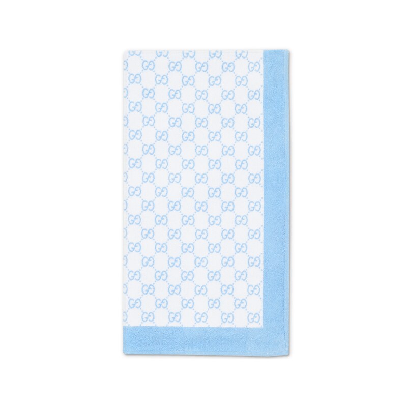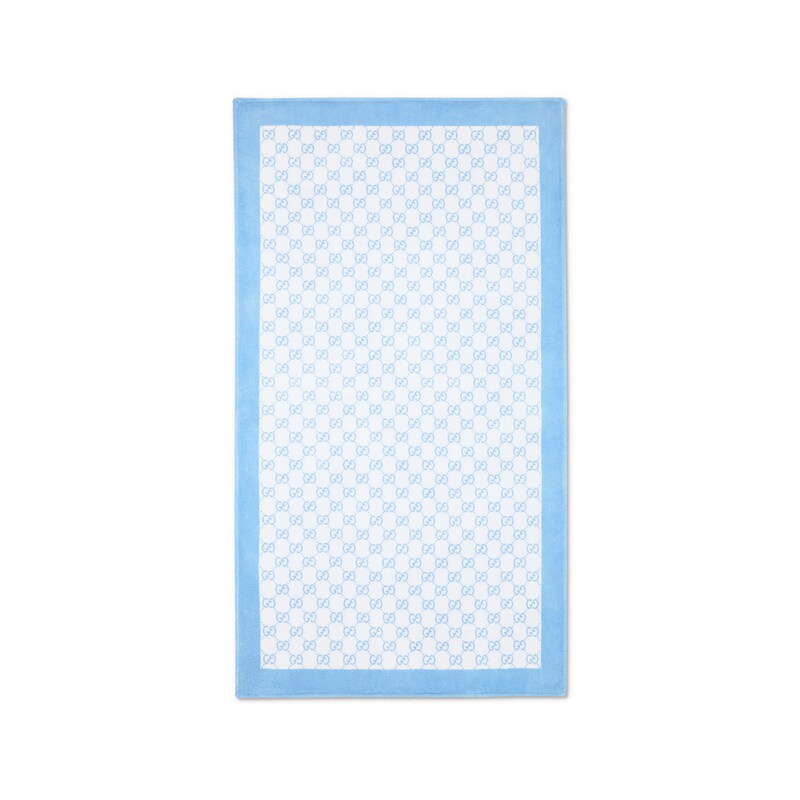 各式软配饰倾心颂扬典藏印花和俏皮配色,其中包括罩衫、渐变效果纺织品及自带收纳袋的可折叠双面帽子。这款沙滩毯以白色GG厚绒布匠心打造,配以浅蓝色滚边。
