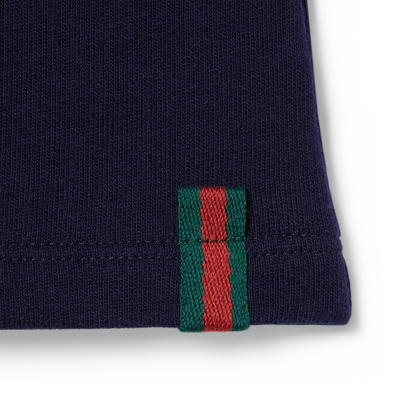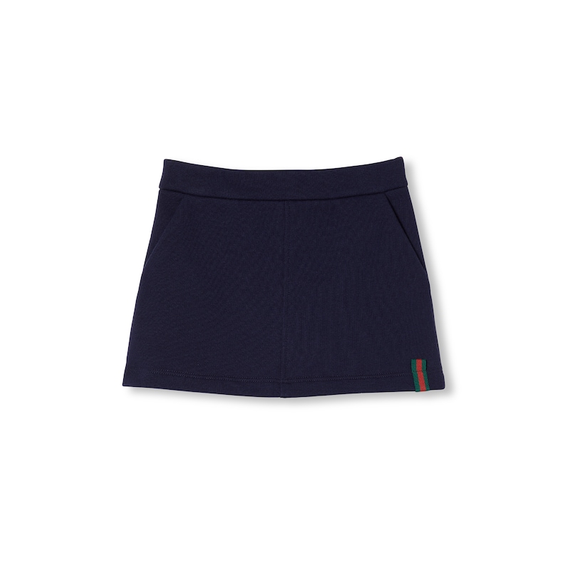 2025早春儿童系列单品以多变风格焕新演绎典藏条纹织带。成衣、鞋履和配饰缀饰绿色和红色滚边,演绎适合每次探险的运动风尚。这款儿童半身裙以毛毡针织棉匠心打造,下摆处缀饰红绿织带细节,尽显别样风采。