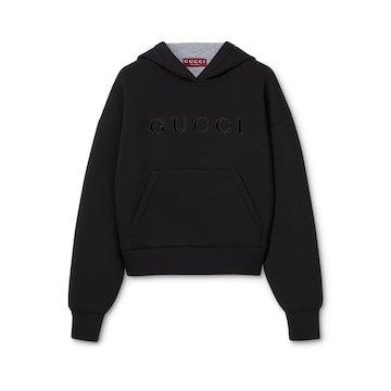 2026早春女士成衣系列以华美材质演绎基础廓形,优雅迎接节庆季。这款卫衣采用黑色双层粘胶纤维针织面料制成,Gucci标识天鹅绒刺绣平添格调。