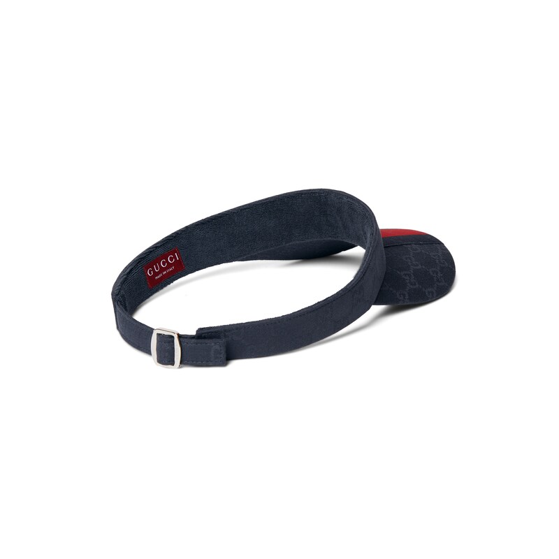 全新GG棉质华达呢面料为Gucci Tennis系列添上一抹深蓝色彩。这款挺括遮阳帽巧妙融入红绿条纹织带,令整个设计魅力更添。
