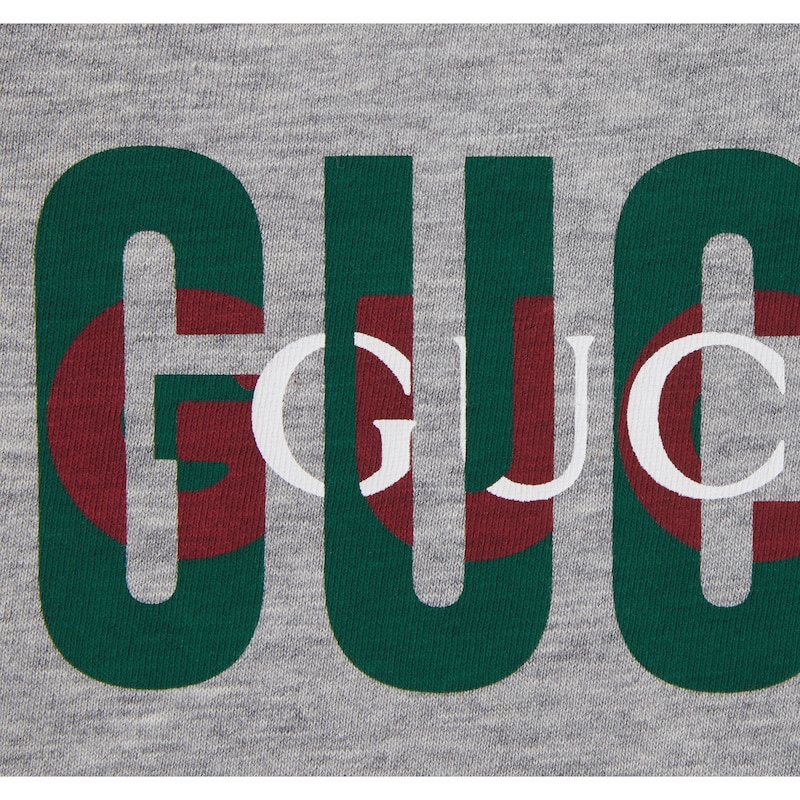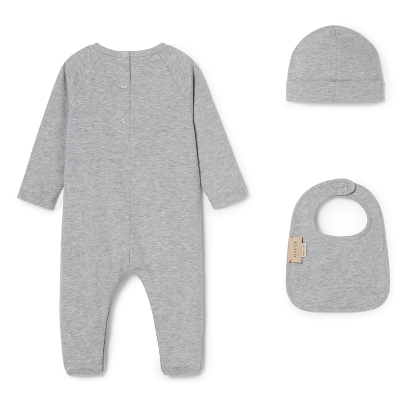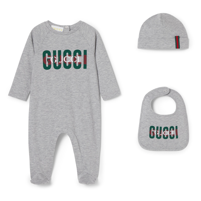 2025早春儿童系列单品以多变风格焕新演绎典藏条纹织带。成衣、鞋履和配饰缀饰绿色/蓝色和红色滚边,演绎适合每次探险的运动风尚。这款婴儿三件套礼品套装选用浅灰色针织棉打造,巧妙融蕴织带细节和Gucci罩纱织带印花。
