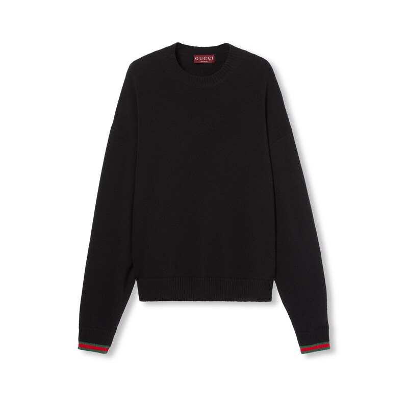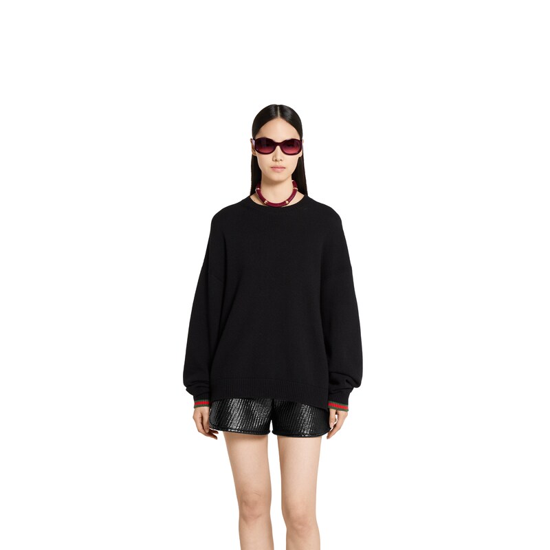 2025春夏系列推出多款休闲华丽风穿搭单品,这款缀饰织带滚边的圆领针织套衫便是其中之一。
