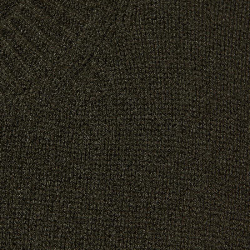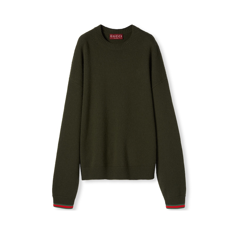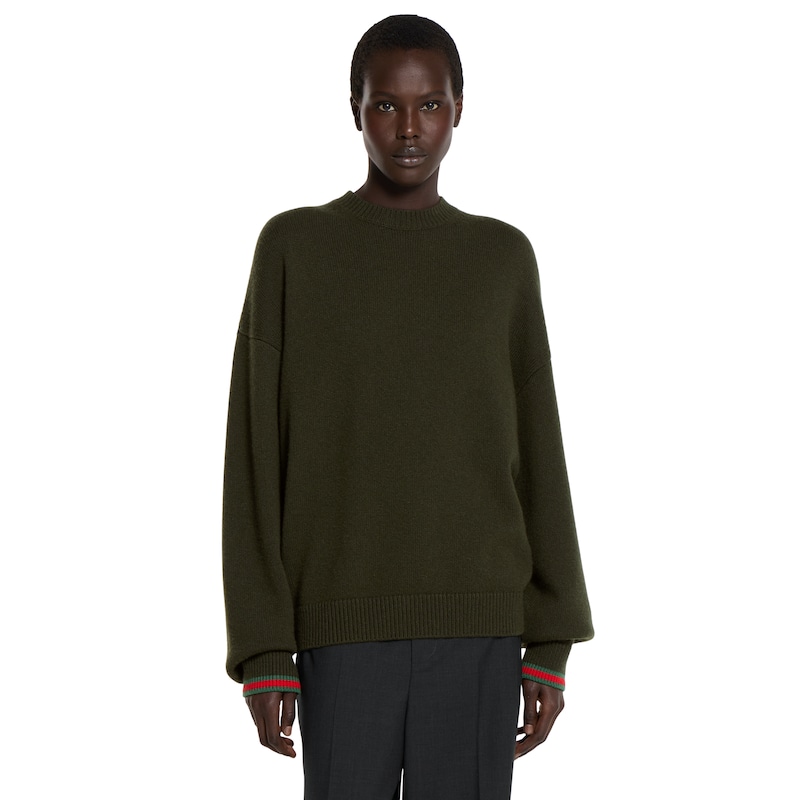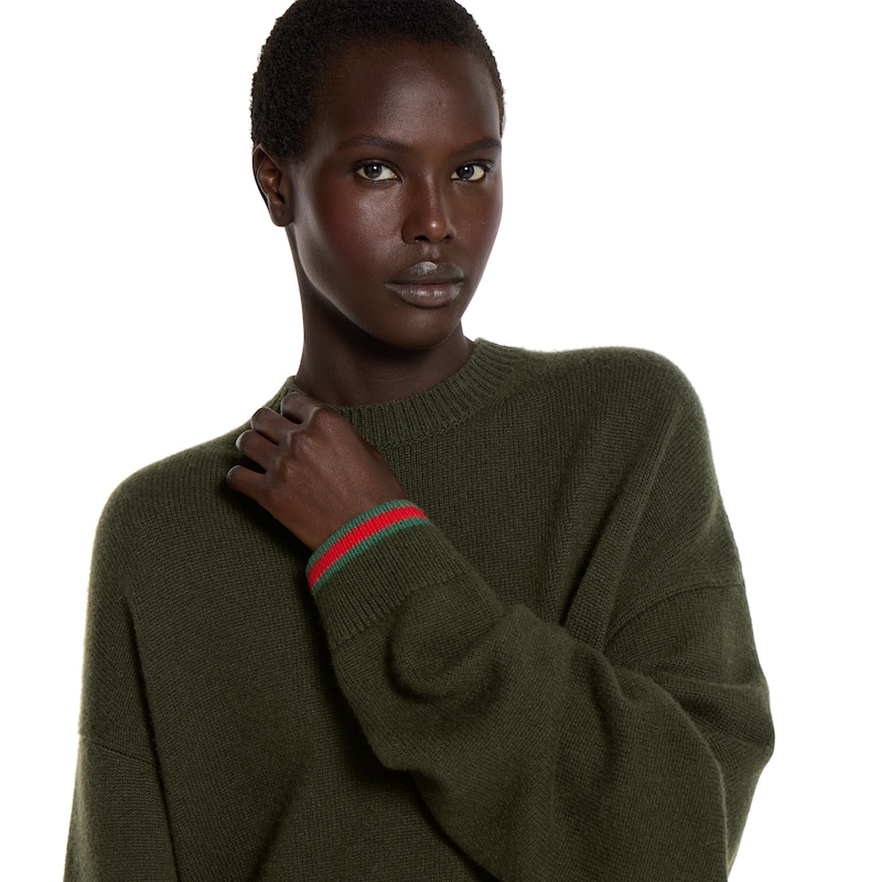 一如秀场所示,系列运用绿色诠释其色彩美学,并在此基调下彰显各种纹理、品牌标识细节和不同色调。这款针织套衫采用落肩设计,选用羊毛山羊绒混纺面料精制而成,配以织带滚边,令整个设计愈发饱满。