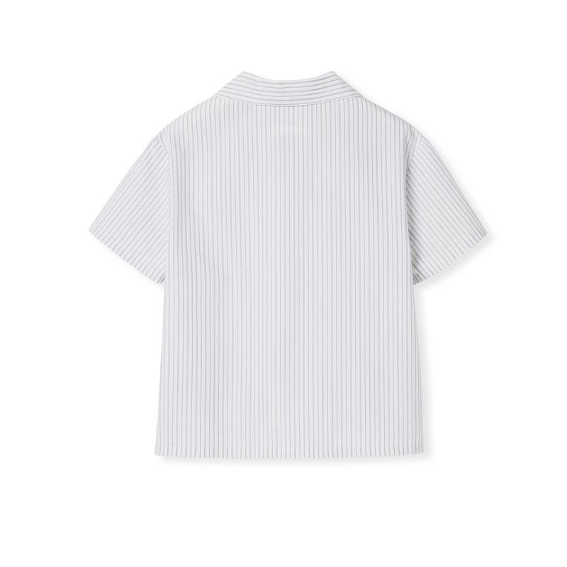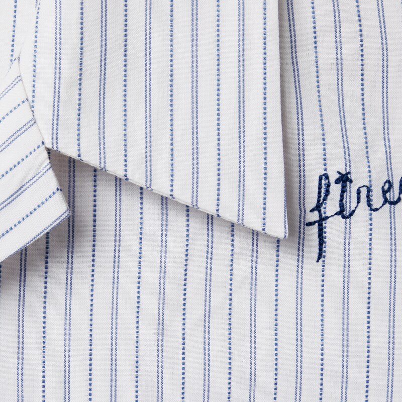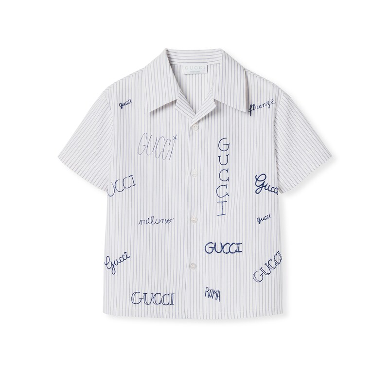 2025早秋儿童系列倾情呈现经典标识细节等一系列备受喜爱的图案。这款儿童衬衫采用条纹平纹细布呈现,通体点缀Gucci城市刺绣。