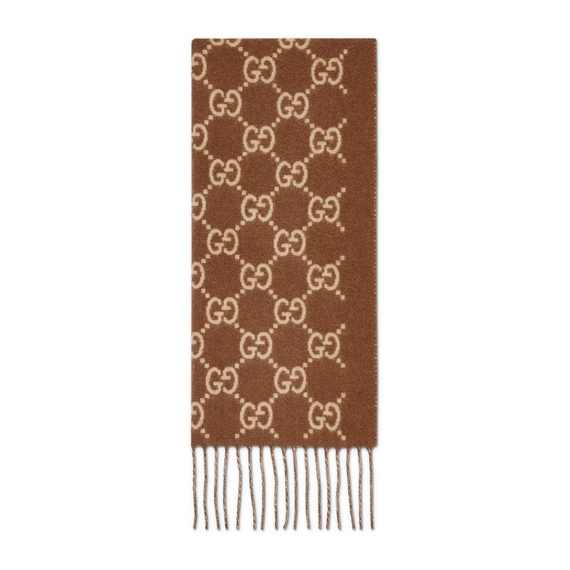 柔软桑蚕丝配饰系列以精致滚边、品牌标识贴饰和精美刺绣为品牌元素注入新鲜活力。这款围巾以GG山羊绒面料匠心打造,巧妙缀饰流苏滚边。