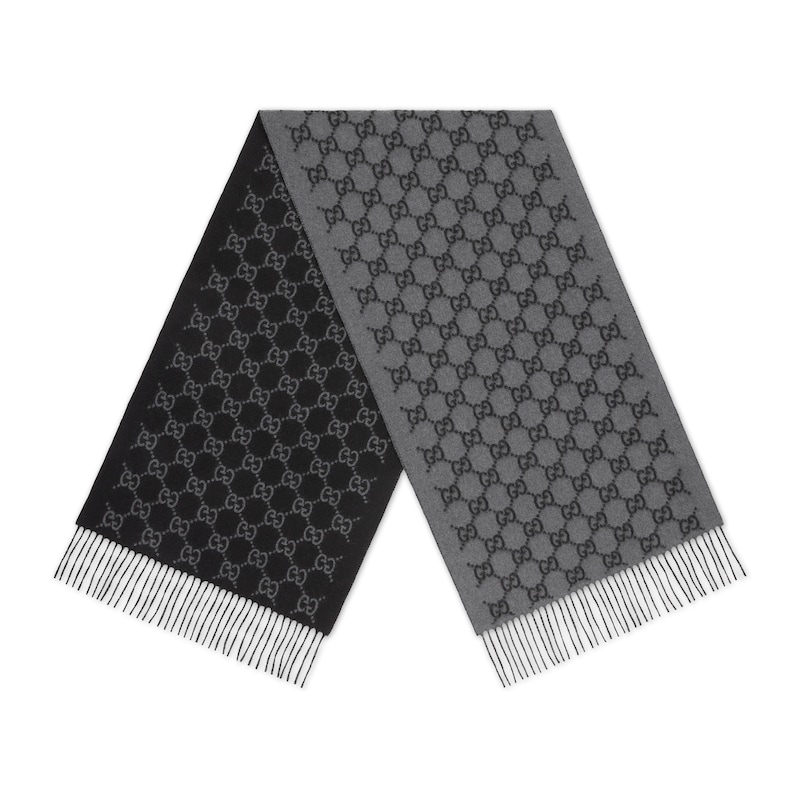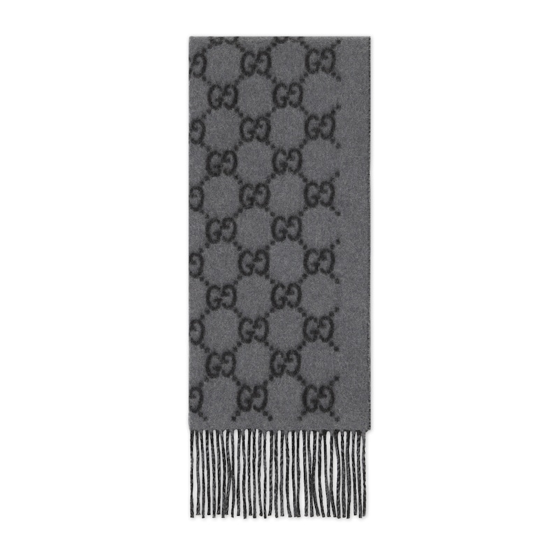 桑蚕丝配饰系列以精致滚边、品牌标识贴饰和精美刺绣为品牌元素注入新鲜活力。这条围巾以GG山羊绒提花面料匠心打造,巧妙缀饰流苏滚边。