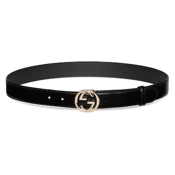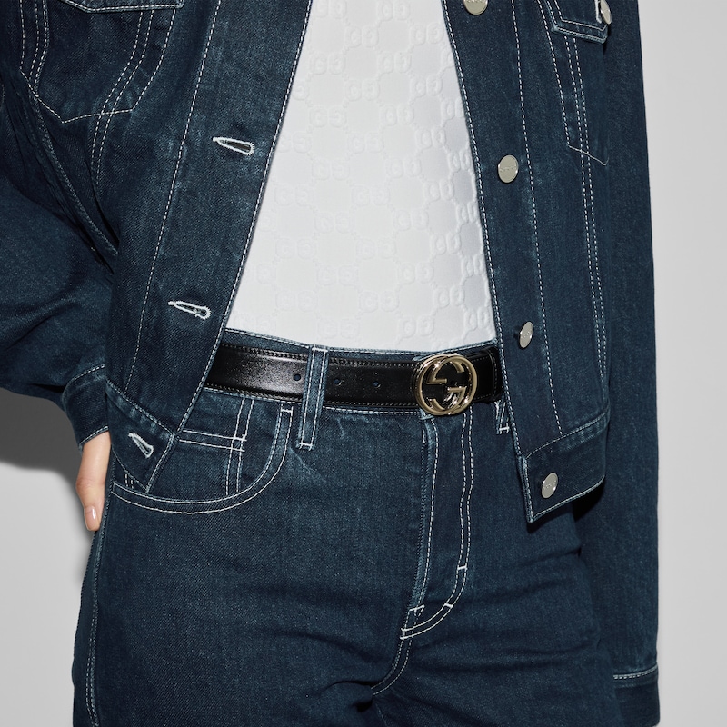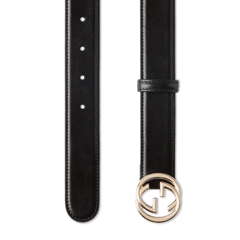 2025早春系列透过现代视角焕新诠释品牌经典元素。这款腰带采用黑色皮革制作,巧妙点缀浅金色调互扣式双G搭扣。