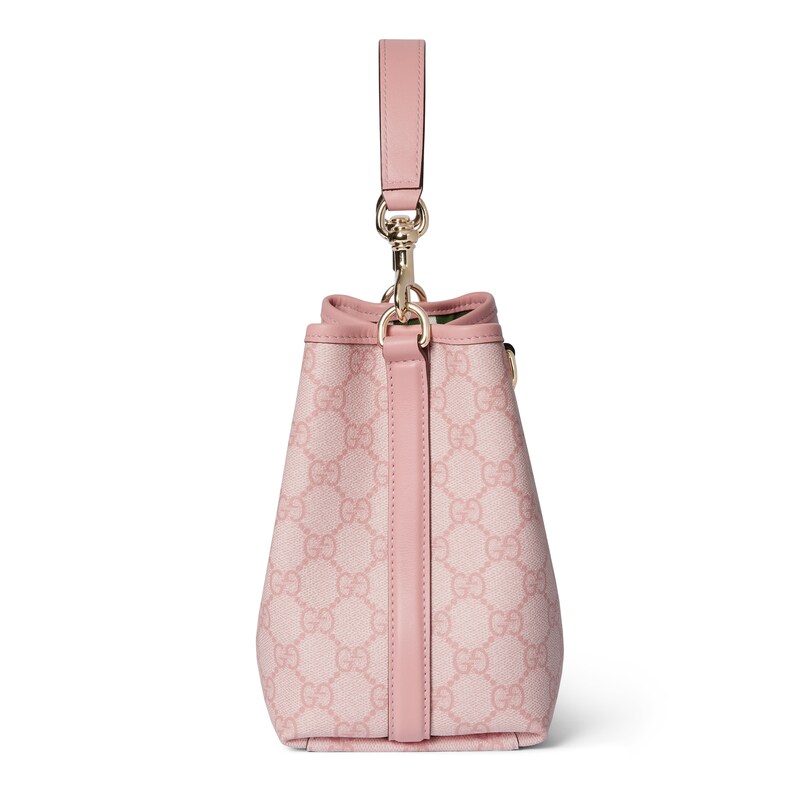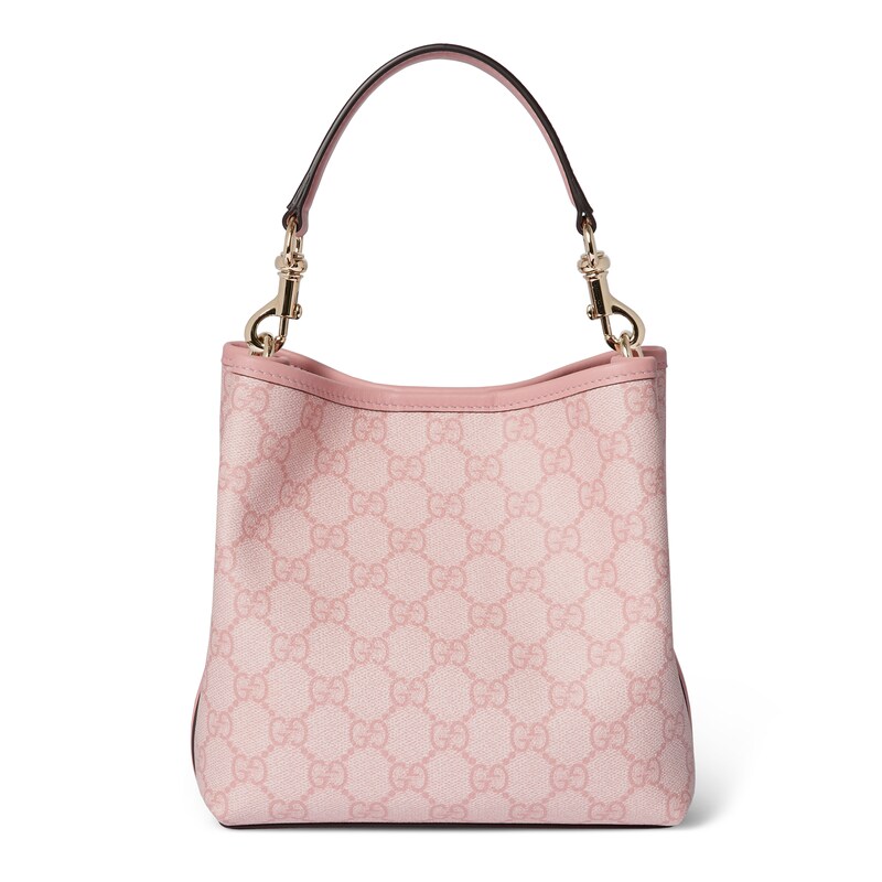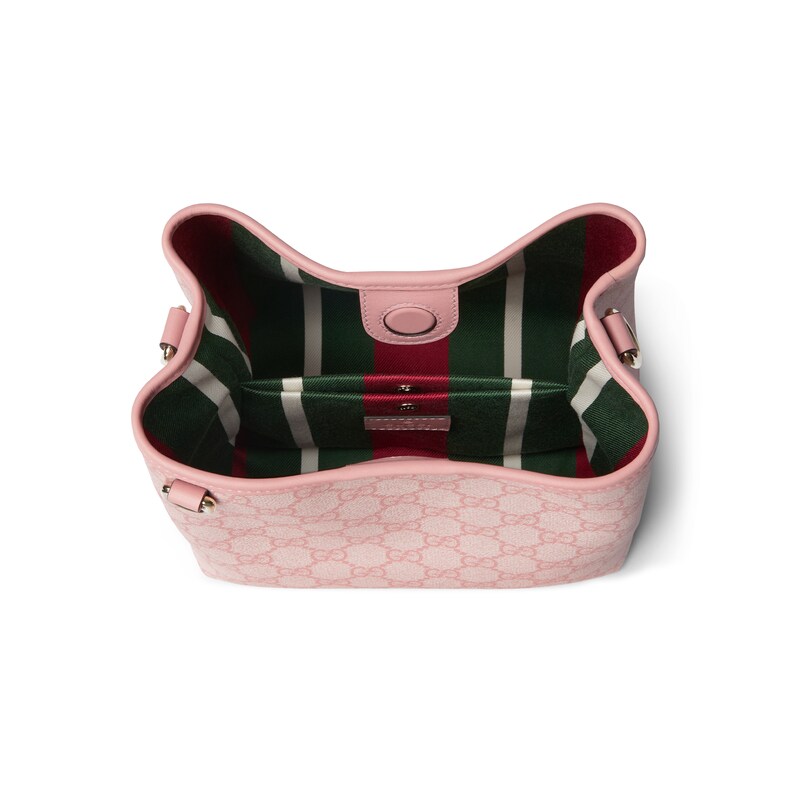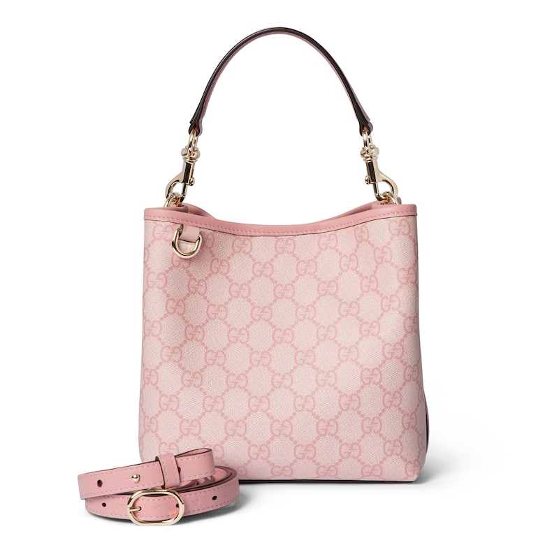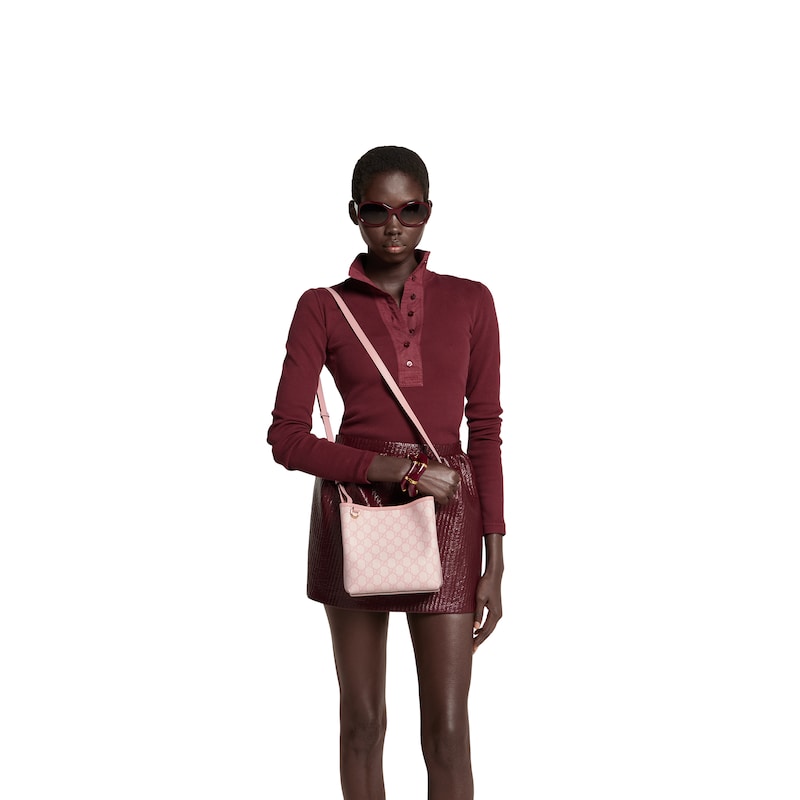 GG Emblem系列焕新诠释品牌的隽永优雅风范和精湛工艺。这款迷你水桶包以浅粉色匠心呈现,配以织带棉质衬里,设有一个内部隔层,精致而不失实用性。