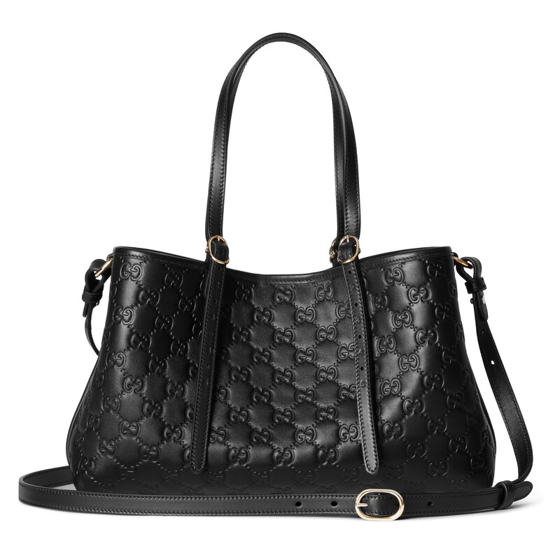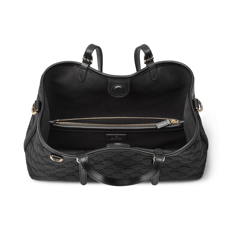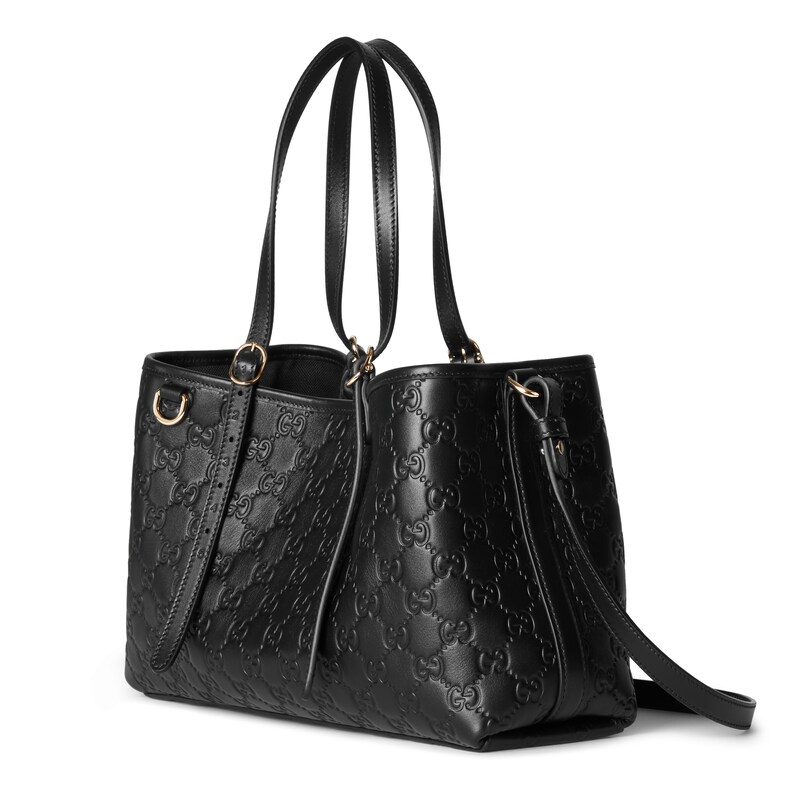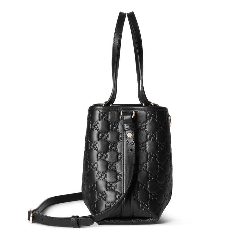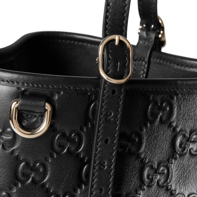 GG Emblem系列焕新诠释品牌的隽永优雅风范和精湛工艺。这款小号托特包配有可调节手柄,饰以示数孔眼,灵感源自马术世界。