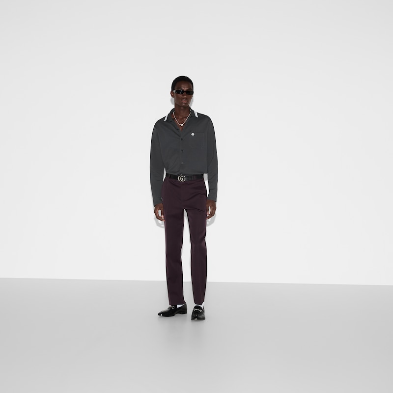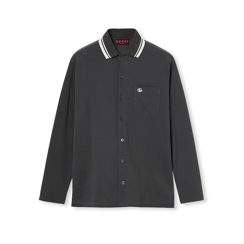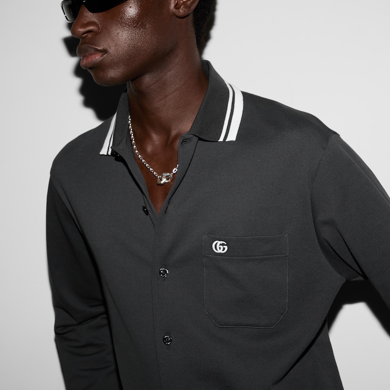Gucci 2025早春系列挚献多款经典风格单品,针织衫和Polo衫质感柔软,以内敛巧致细节出彩,令日常造型更显迷人。这款常规版型Polo衫以弹力珠地棉匠心打造,搭配双G刺绣和条纹Polo领,更显精巧雅致。