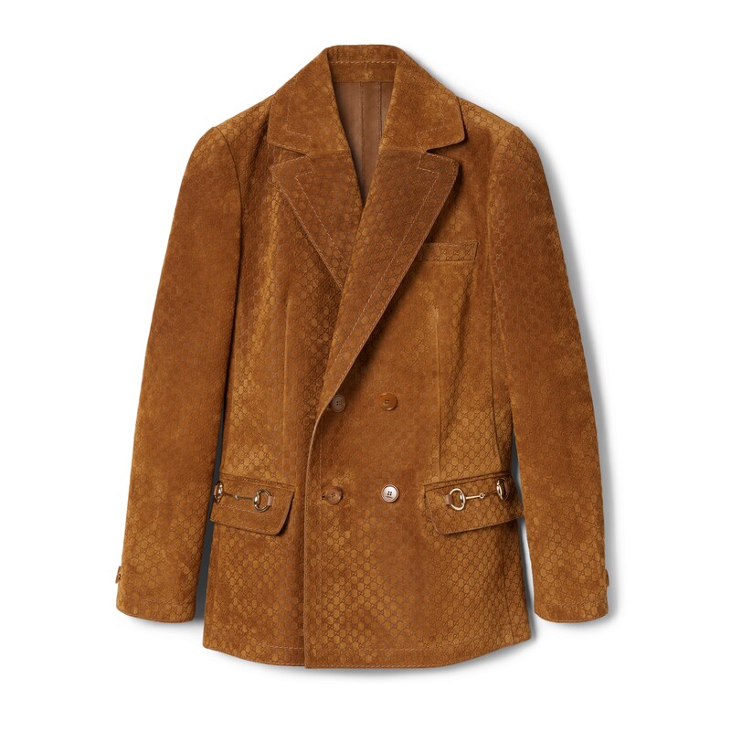Gucci 2025早春系列呈献多款外套佳作,以牛皮革原色演绎夹克等充满个性风采的单品。多种材质与多样配色交织,淡雅色调与轻质面料融合,令造型灵巧动人。这款双排扣夹克采用棕色GG绒面材质打造,口袋巧妙缀饰马衔扣配件细节。