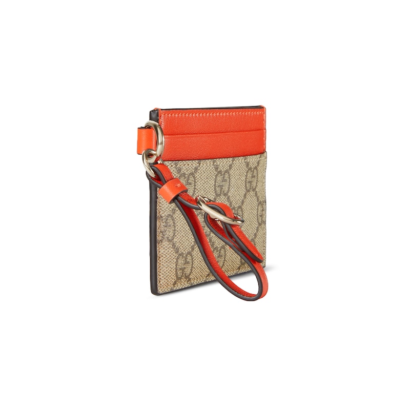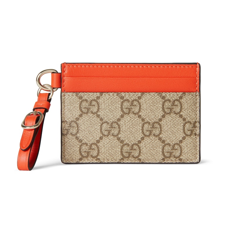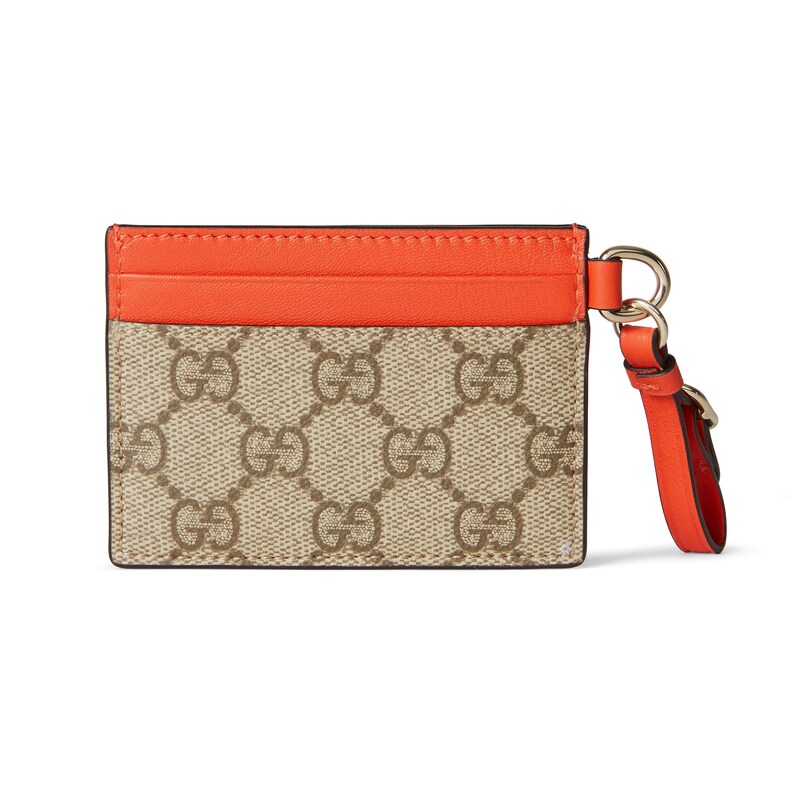 GG Emblem系列采用充满活力的皮革滚边设计,营造浓郁夏日风情。这款卡片夹选用GG字母图案涂层织物制作,搭配撞色皮革滚边细节,增添一抹亮眼色彩。