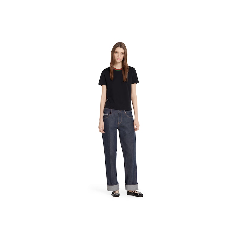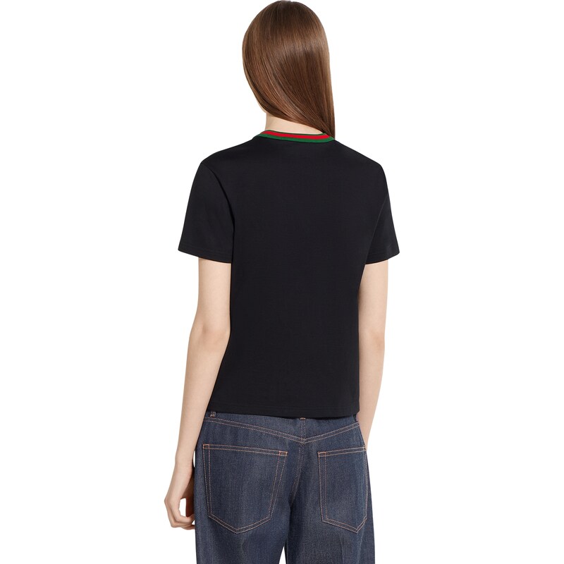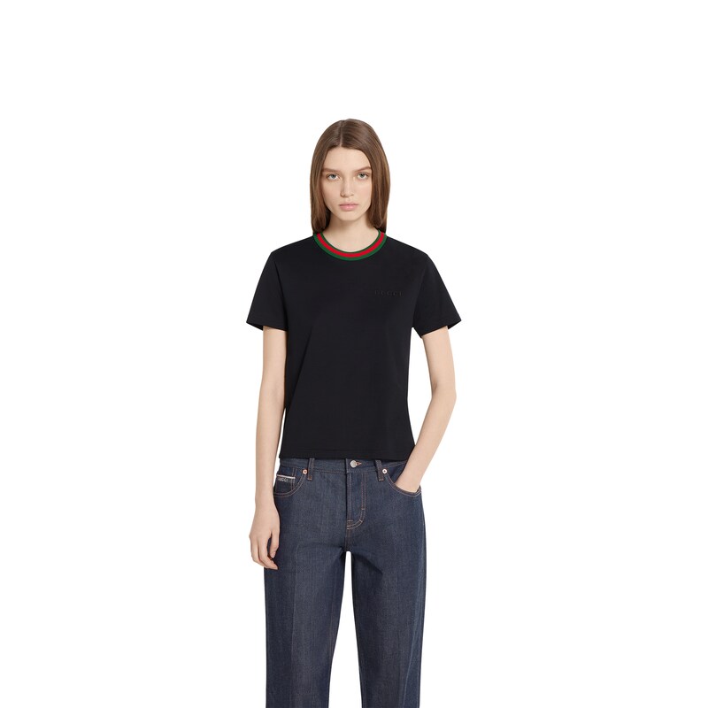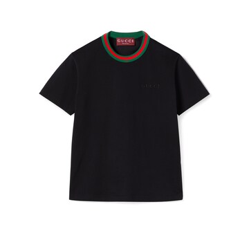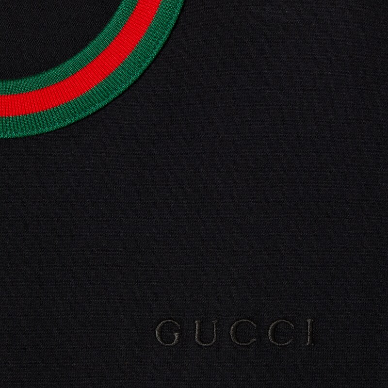 品牌元素持续焕新,演绎休闲风T恤和针织服饰。这款短袖T恤以轻质针织棉打造,缀饰Gucci标识贴饰和织带滚边。