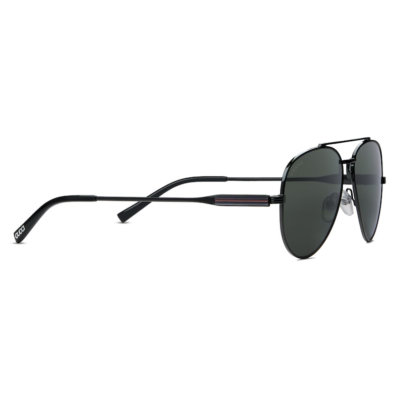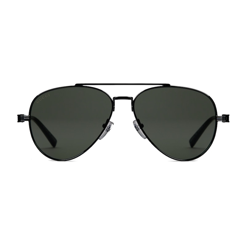 2025早春眼镜系列融合飞行员镜框与经典图案,散发隽永韵味。这款太阳眼镜采用金属镜框,镜腿饰有Gucci刻花标识和织带细节。