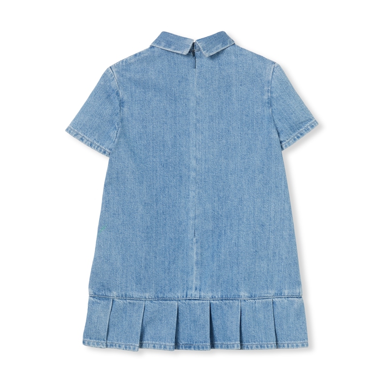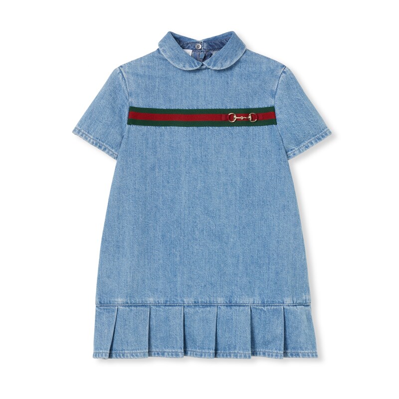 2025早秋儿童系列单品以多变风格焕新演绎典藏条纹织带。成衣、鞋履和配饰缀饰绿色和红色滚边,演绎适合每次探险的运动风尚。这款儿童连衣裙以水洗丹宁面料匠心打造,缀饰红绿条纹织带与马衔扣细节,更添魅力。