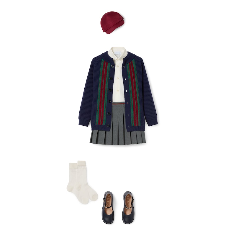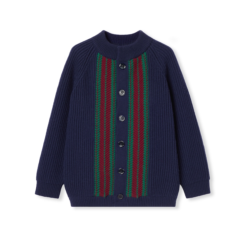 全新儿童系列单品以多变风格焕新演绎典藏条纹织带。成衣、鞋履和配饰缀饰绿色和红色滚边,演绎适合每次探险的运动风尚。这款儿童开衫以羊毛材质打造,胸口处巧妙融入撞色织带细节。