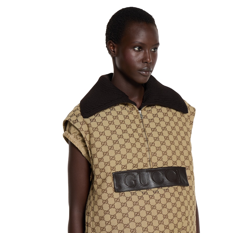 品牌典藏图案与休闲丹宁面料、轻质帆布和精致绒面材质等纹理精美的面料交相辉映,令系列熠熠生辉。这款马甲选用GG帆布精制而成,前幅缀饰Gucci皮革标签,尽释别样风采。