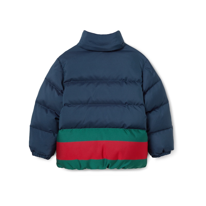 全新儿童系列单品以多变风格焕新演绎典藏条纹织带。成衣、鞋履和配饰缀饰绿色和红色滚边,演绎适合每次探险的运动风尚。这款儿童夹克以加衬尼龙匠心打造,背面巧妙融入织带细节。