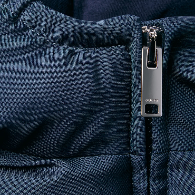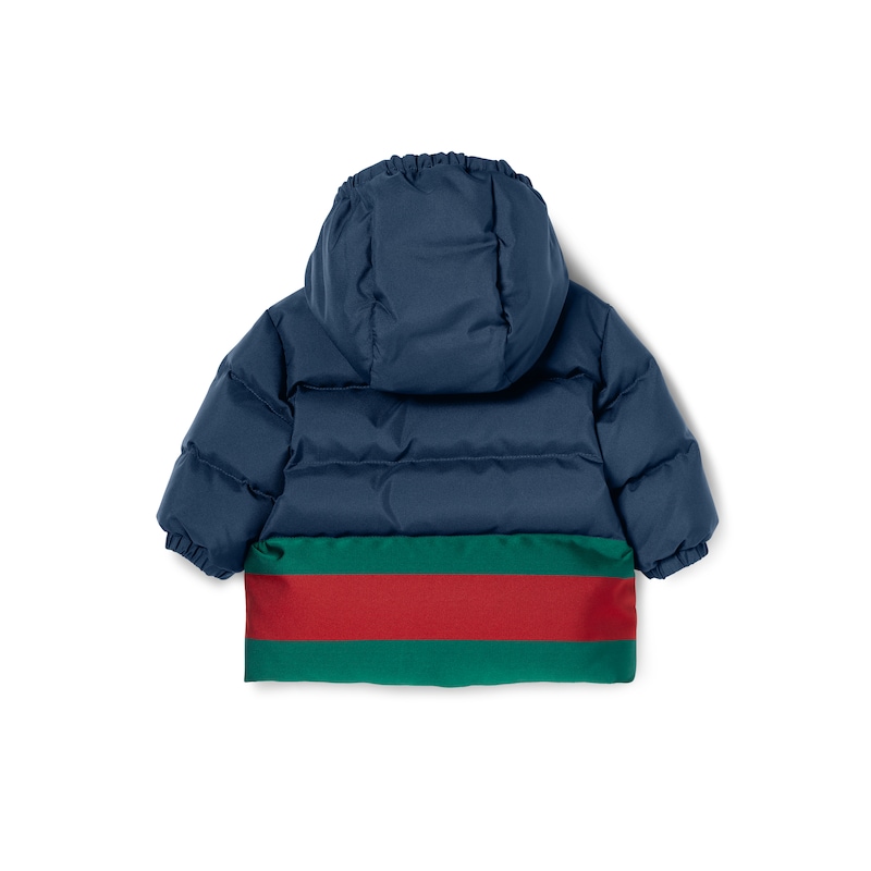 全新儿童系列单品以多变风格焕新演绎典藏条纹织带。成衣、鞋履和配饰缀饰绿色和红色滚边,演绎适合每次探险的运动风尚。这款婴儿夹克以加衬尼龙匠心打造,背面巧妙融入织带细节。