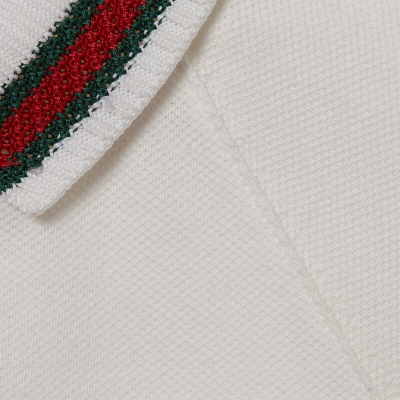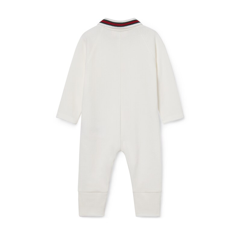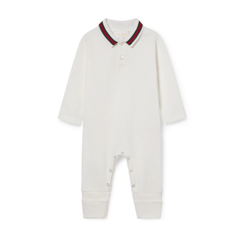 2025早秋儿童系列单品以多变风格焕新演绎典藏条纹织带。成衣、鞋履和配饰缀饰绿色和红色滚边,演绎适合每次探险的运动风尚。这款婴儿连体衣以白色弹力珠地棉打造,巧妙融入针织织带滚边。