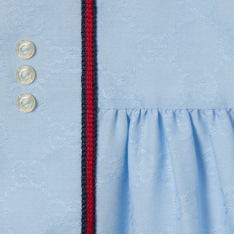 2025早秋儿童系列单品以多变风格焕新演绎典藏条纹织带。成衣、鞋履和配饰缀饰绿色和红色滚边,演绎适合每次探险的运动风尚。这款婴儿连衣裙采用GG棉质提花面料呈现,缀饰刺绣红蓝织带滚边。