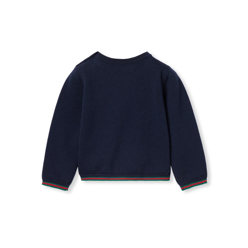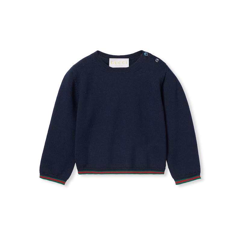 2025早秋儿童系列单品以多变风格焕新演绎典藏条纹织带。成衣、鞋履和配饰缀饰绿色和红色滚边,演绎适合每次探险的运动风尚。这款婴儿羊毛衫采用蓝色羊毛面料匠心打造,缀饰织带滚边。