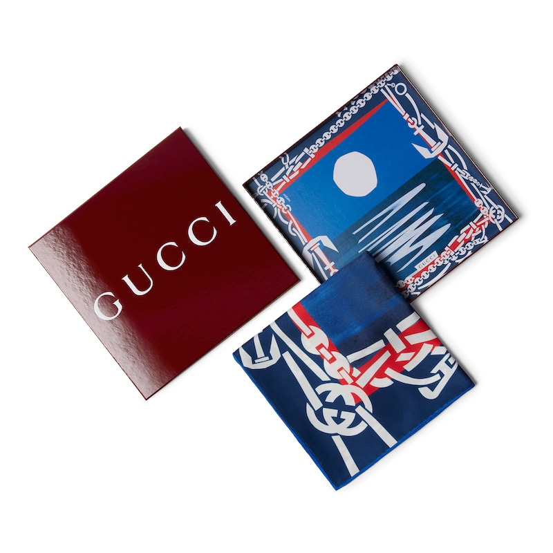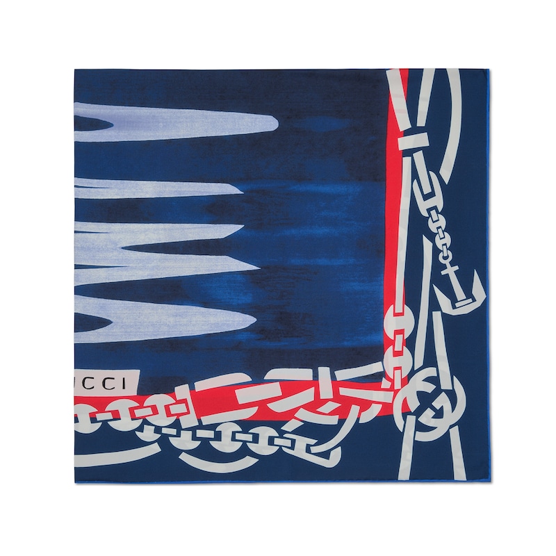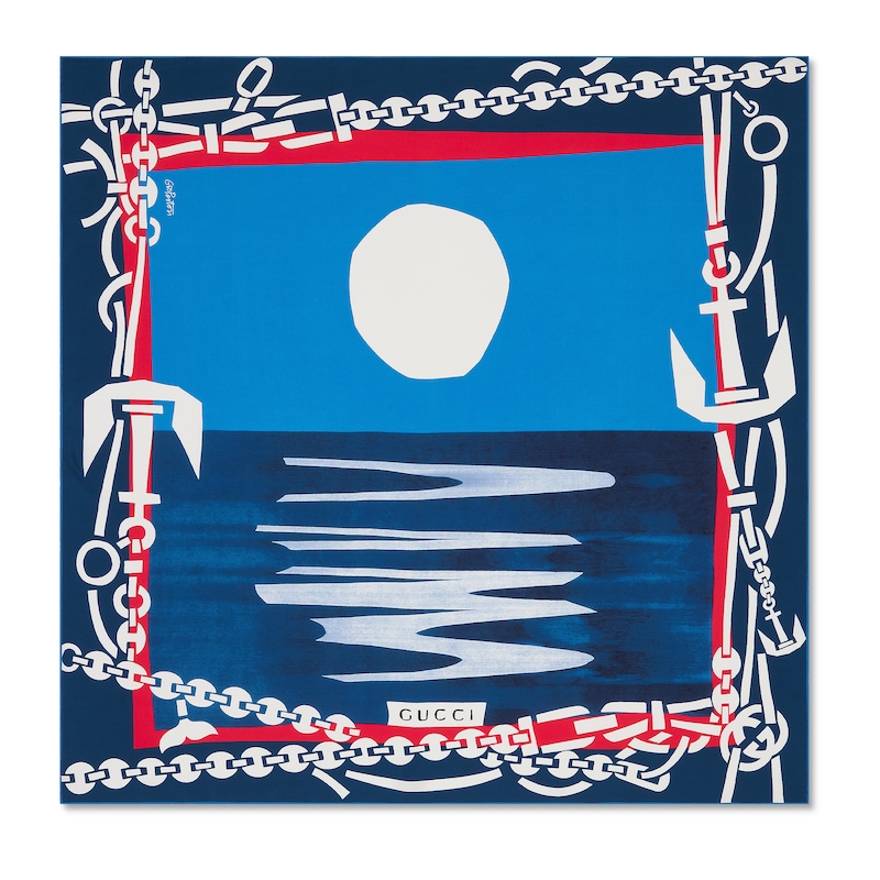 插画家Gio Pastori革新演绎Gucci航海风格图案,为90 x 90版方巾系列再添新作。他因剪纸技艺被大众熟知,所创作的作品具有强烈的视觉冲击力。