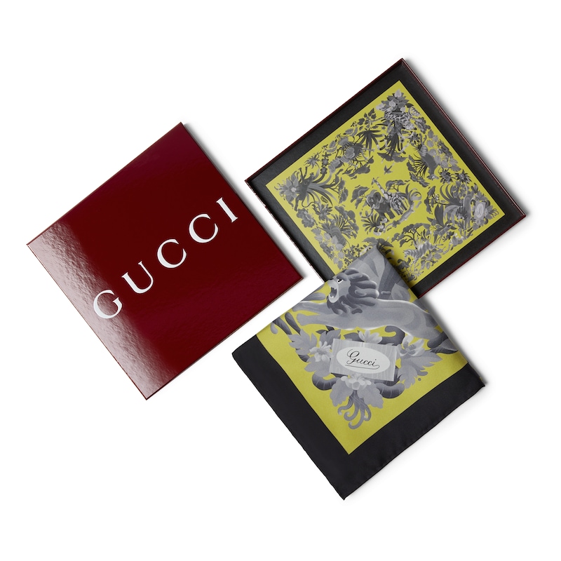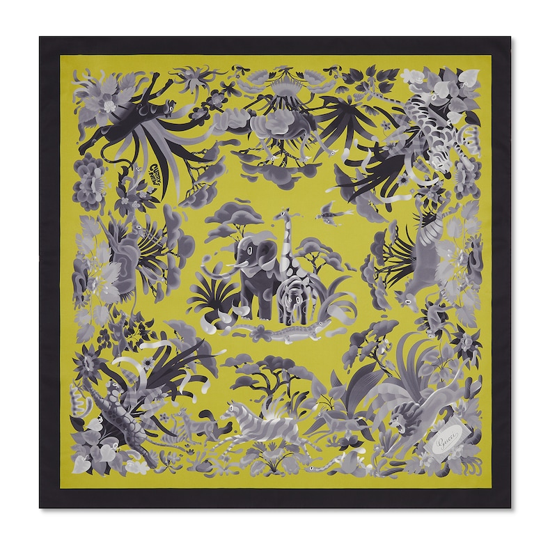 艺术家Currynew(咖喱牛)创新演绎Gucci自然风情图案,为90 x 90版方巾系列再添新作。他的作品以数字创作见称,将流行文化、音乐和电子游戏相融合。