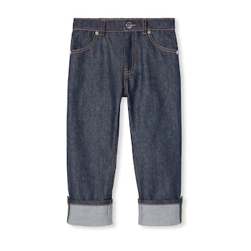 2025早秋儿童系列单品以多变风格焕新演绎典藏条纹织带。成衣、鞋履和配饰缀饰绿色和红色滚边,演绎适合每次探险的运动风尚。这款儿童长裤采用丹宁面料匠心打造,缀饰红绿织带滚边,魅力倍增。