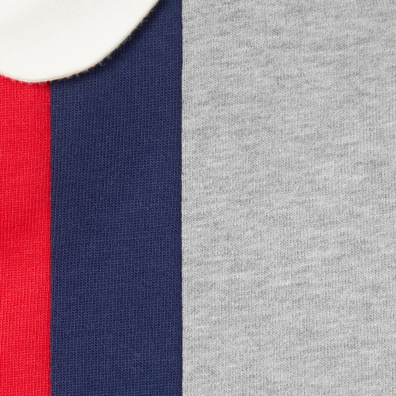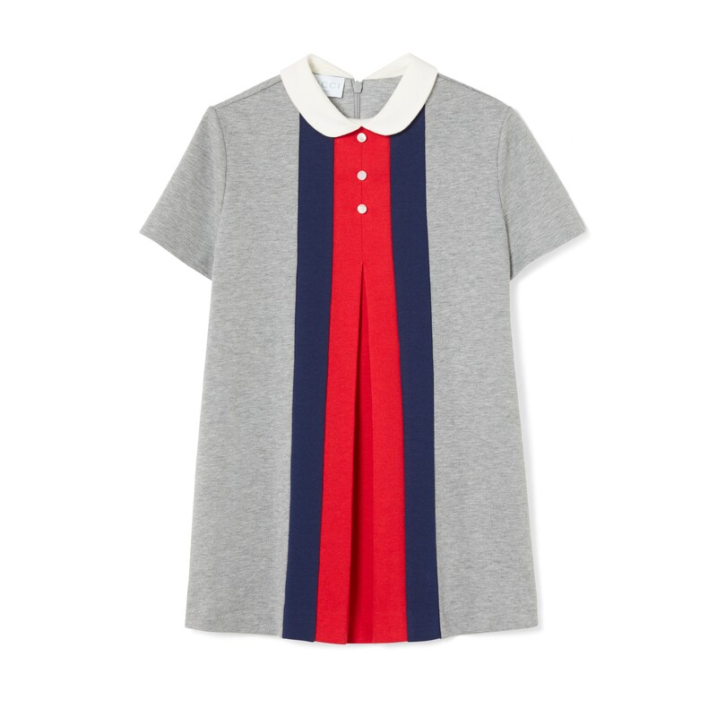 2025早秋儿童系列单品以多变风格焕新演绎典藏条纹织带。成衣、鞋履和配饰缀饰蓝色和红色滚边,演绎适合每次探险的运动风尚。这款儿童连衣裙采用针织棉打造,中央点缀条纹织带,令整个设计魅力更显。