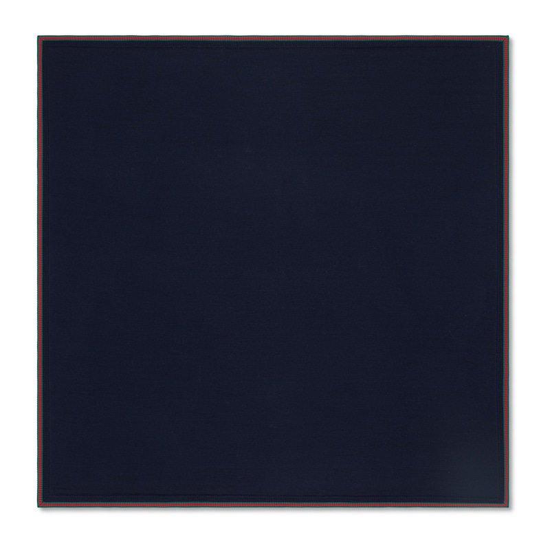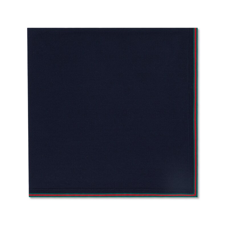 2025早秋儿童系列单品以多变风格焕新演绎典藏条纹织带。成衣、鞋履和配饰缀饰绿色和红色滚边,演绎适合每次探险的运动风尚。这款婴儿盖毯采用深蓝色针织羊毛面料匠心打造,缀饰织带滚边。