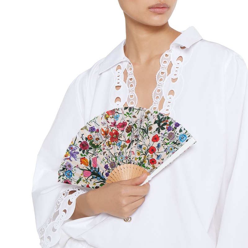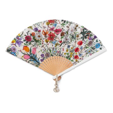 经典花卉印花以浪漫气质回归2025早秋系列。这款小号扇子由丝缎和木材匠心打造,缀饰通体花卉印花。双G吊坠细节令整款单品魅力倍增。