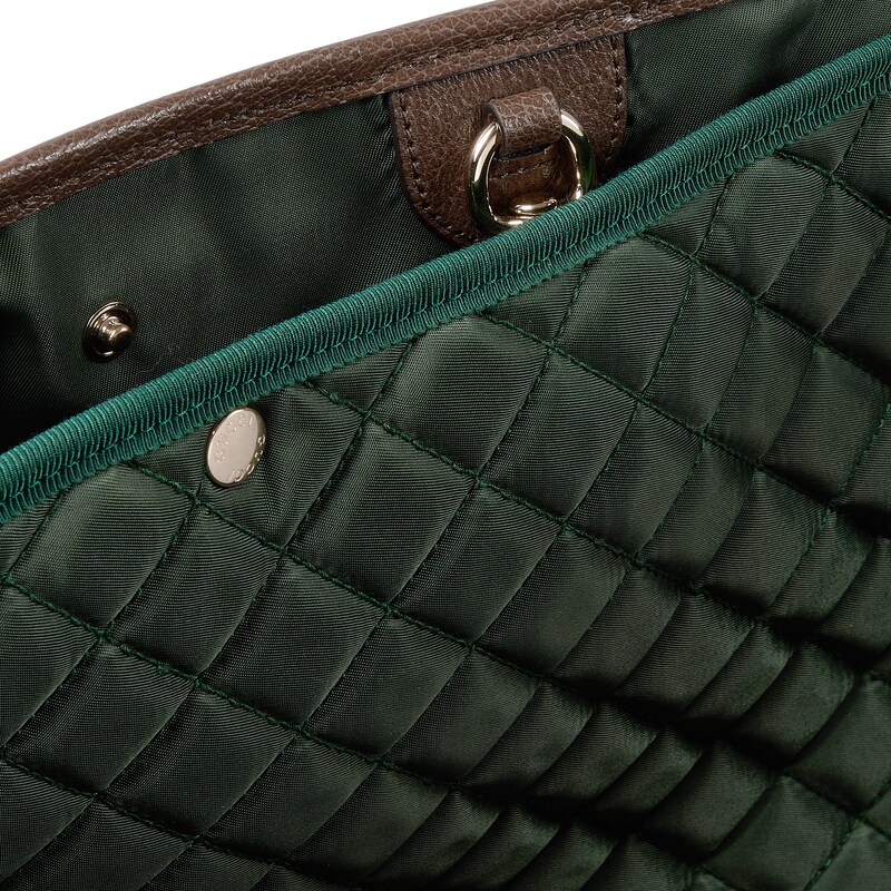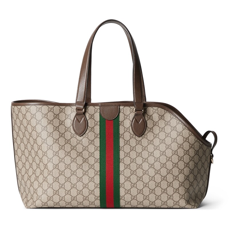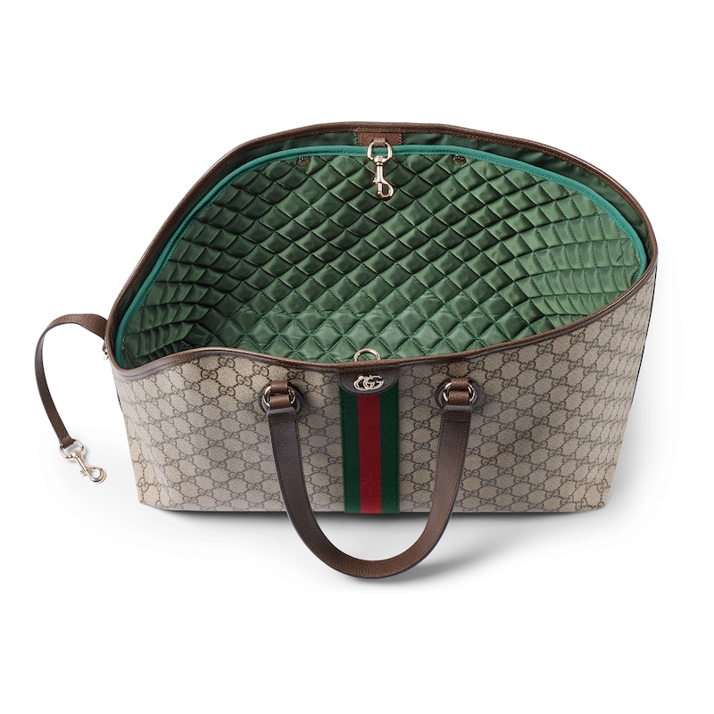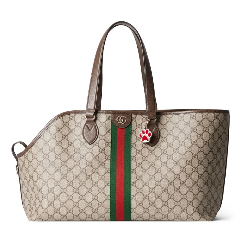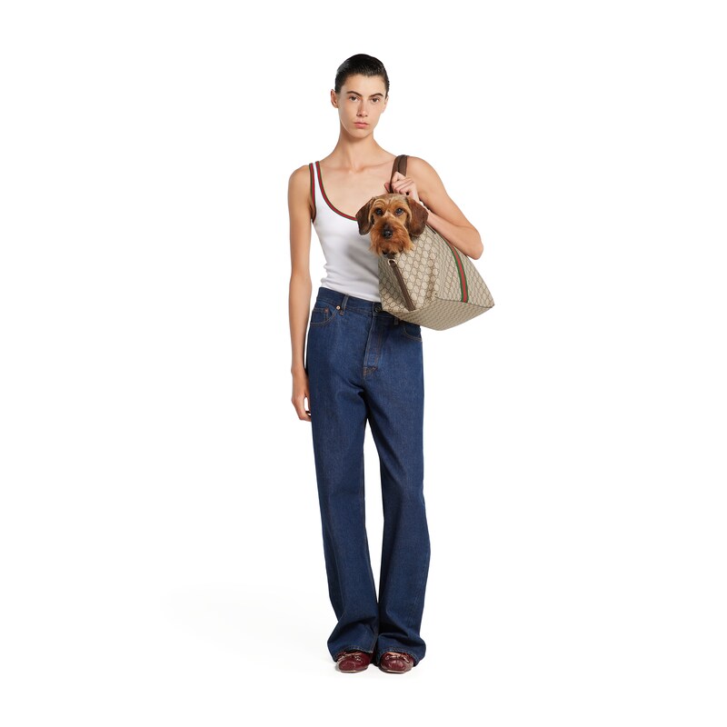 2025早秋系列继续开疆拓土,推出融蕴品牌经典细节和配色的宠物托特包和睡床。这款托特包以GG字母交织图案涂层织物匠心打造,缀饰红绿条纹织带和双G细节。