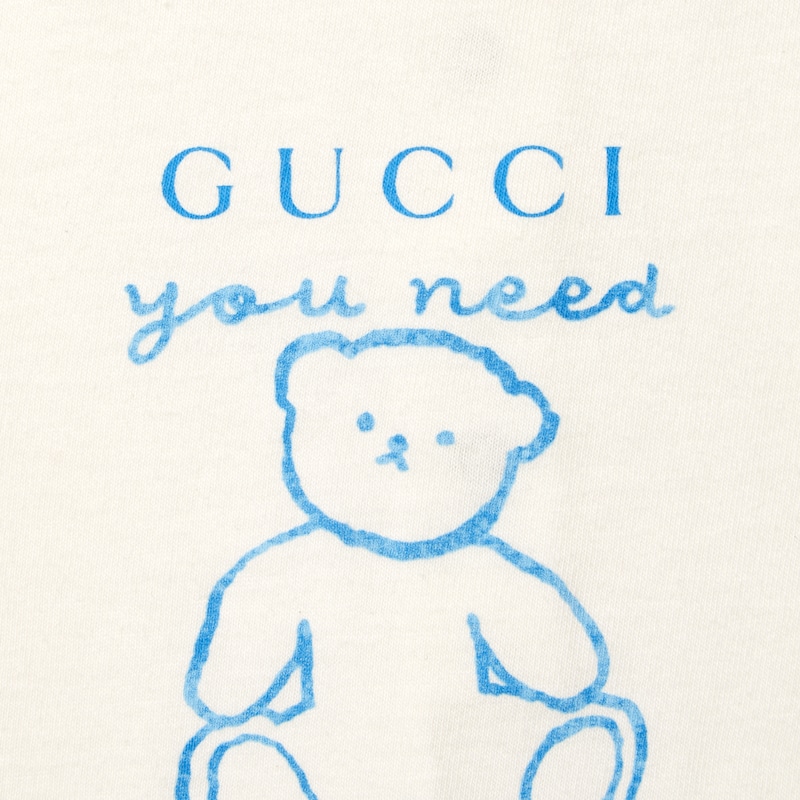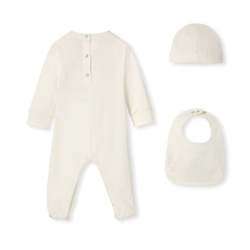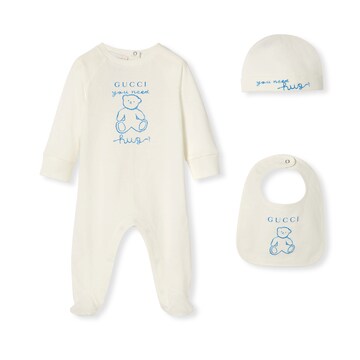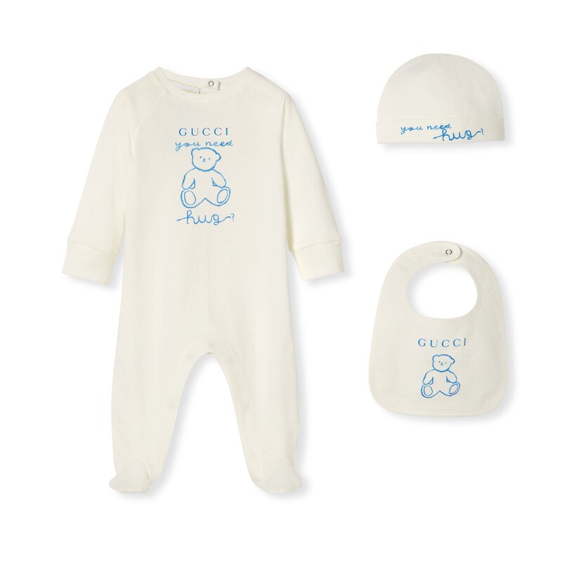 画家Naon Jeong从日常生活和本土文化中汲取灵感,创作出趣意十足且充满怀旧气息的设计。她将小猫印花和其他趣味图案与品牌名称糅为一体,为2025早春儿童系列添姿加彩。这款婴儿三件套礼品套装采用针织棉匠心打造,饰以Gucci小熊“You need hug?”印花,令整个设计趣味倍增。