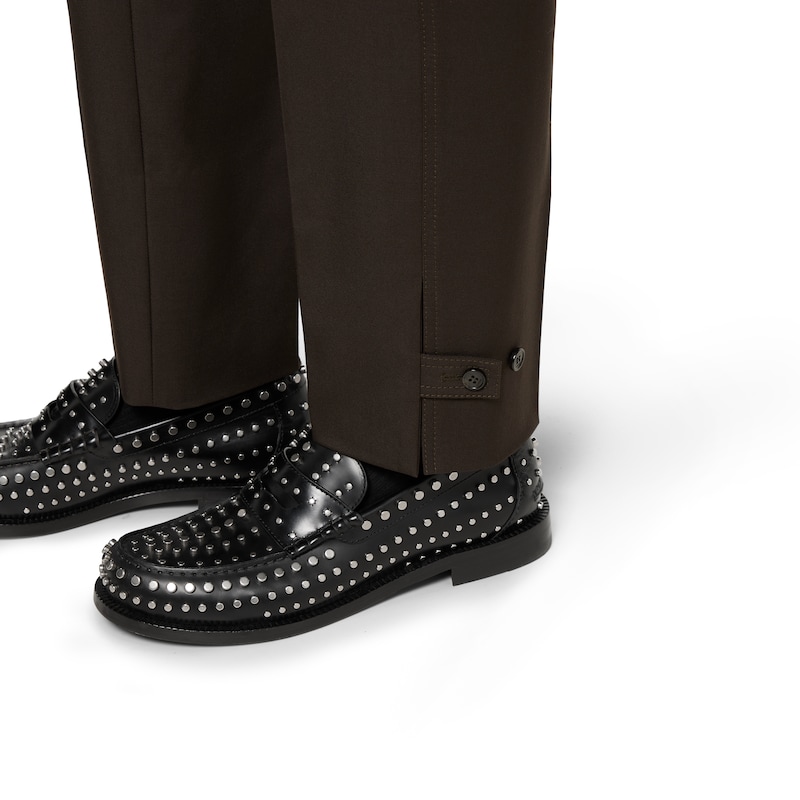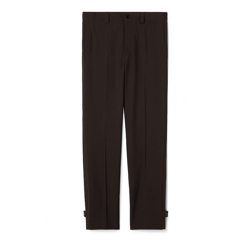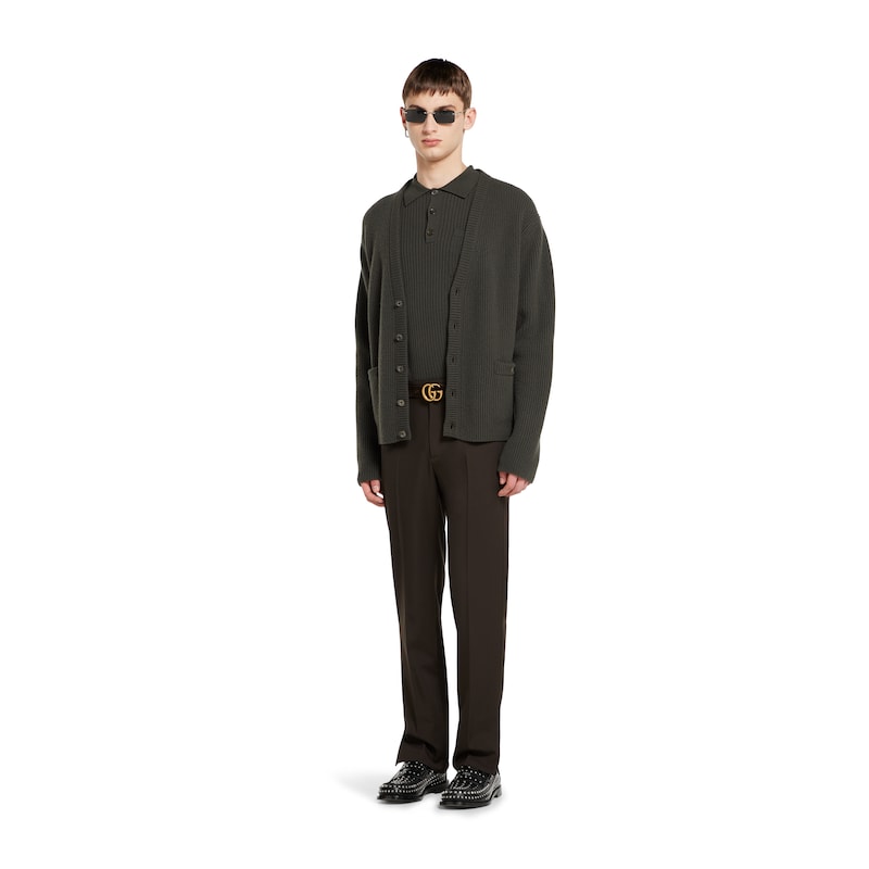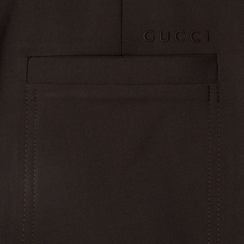 休闲风正装引入全新轮廓和剪裁,为2025早秋系列增色添彩。这款长裤以深棕色羊毛华达呢打造,匠心缀饰Gucci压花标识,尽释别致风韵。