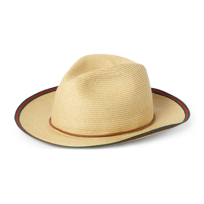 2025早秋软配饰系列以精致滚边、标识贴饰和精美刺绣为品牌元素注入新鲜活力。这款帽子以原色稻草编制而成,匠心融蕴织带滚边,令整个设计愈发亮眼。