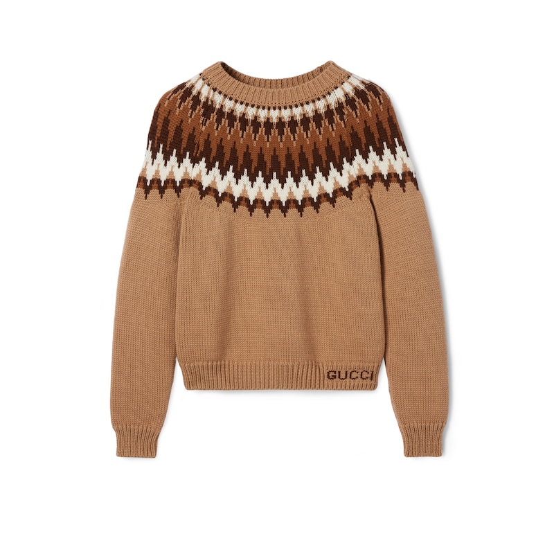 秋日色调赋予多款正装单品以独特魅力,与品牌典藏细节相互衬托,成辉映之势。隽永雅韵邂逅现代风尚,利落剪裁携手宽松版型。这款针织套衫以驼色和多色厚羊毛针织面料打造,匠心缀饰Gucci嵌花。