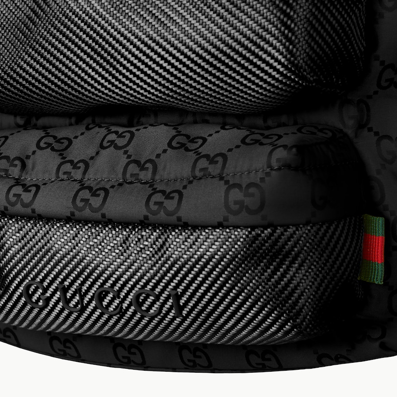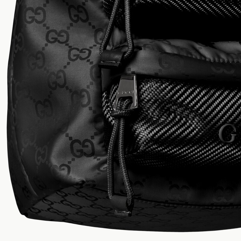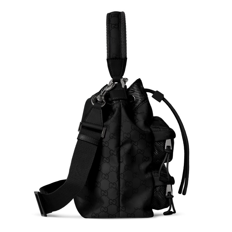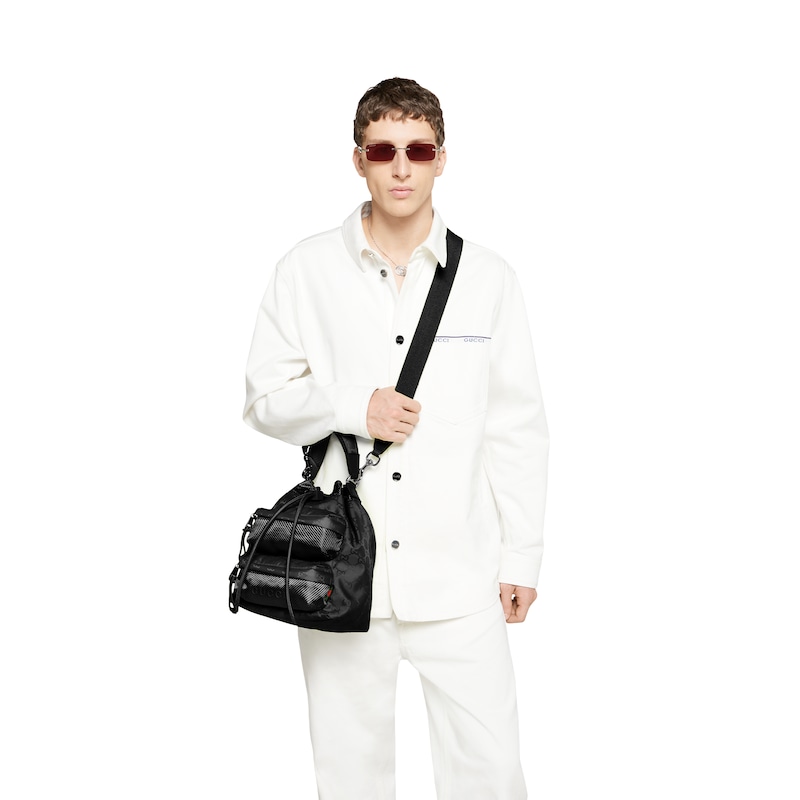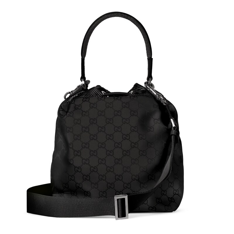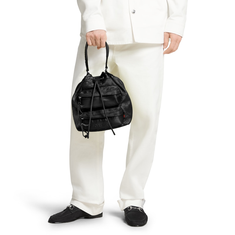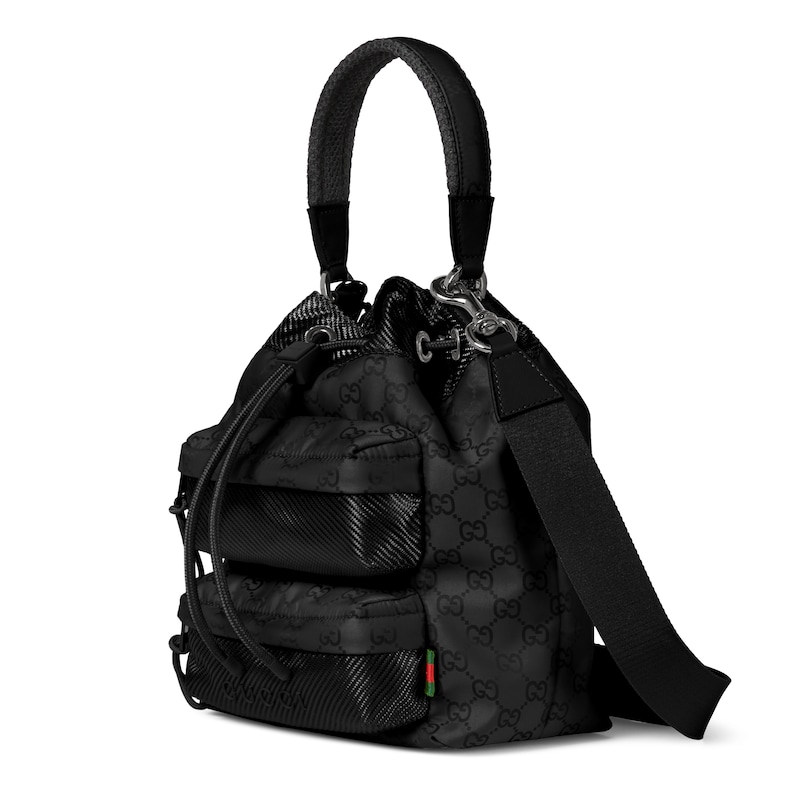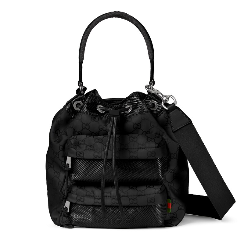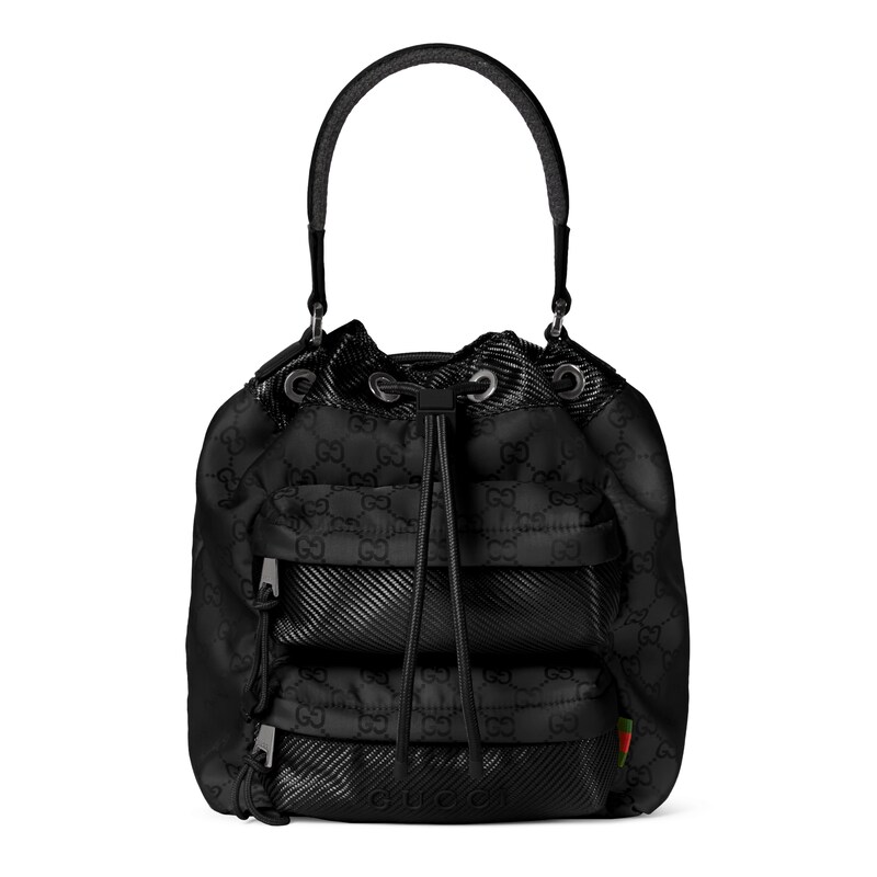 轻便耐用的GG尼龙面料携全新功能和醒目色调焕新亮相。在这款水桶包之上,它以亮眼之姿匠心呈现,与红绿织带细节相得益彰。